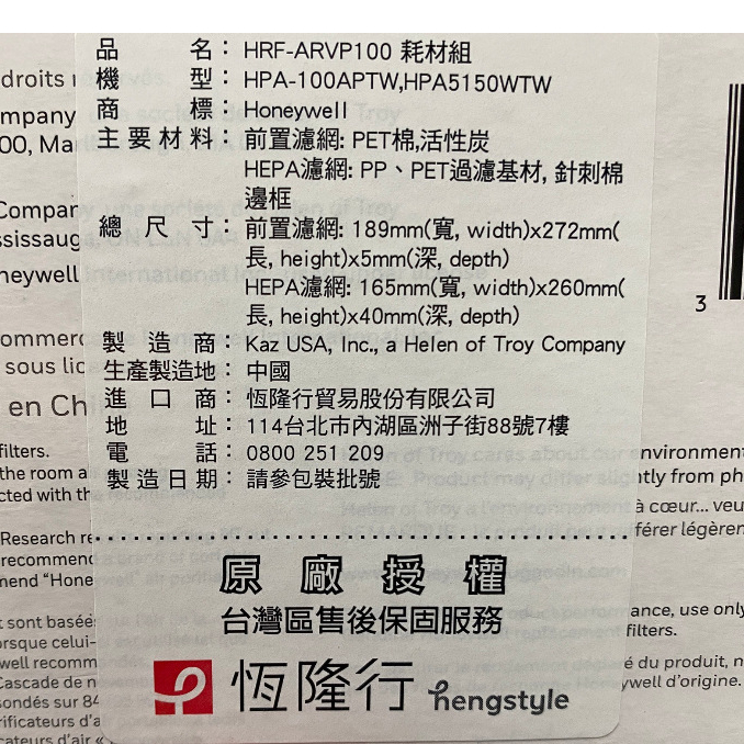 Honeywell 原廠耗材 HRF-ARVP100 (適用HPA-100/HPA-5150)
