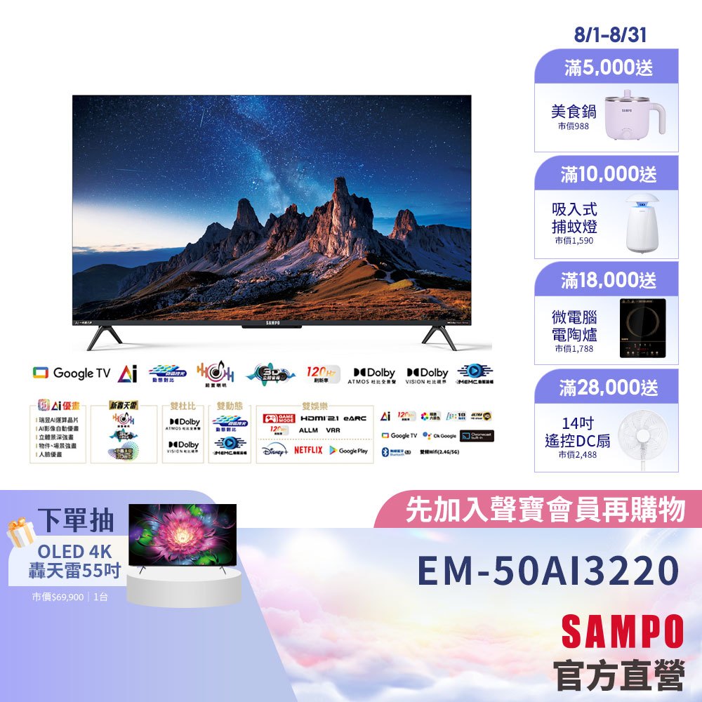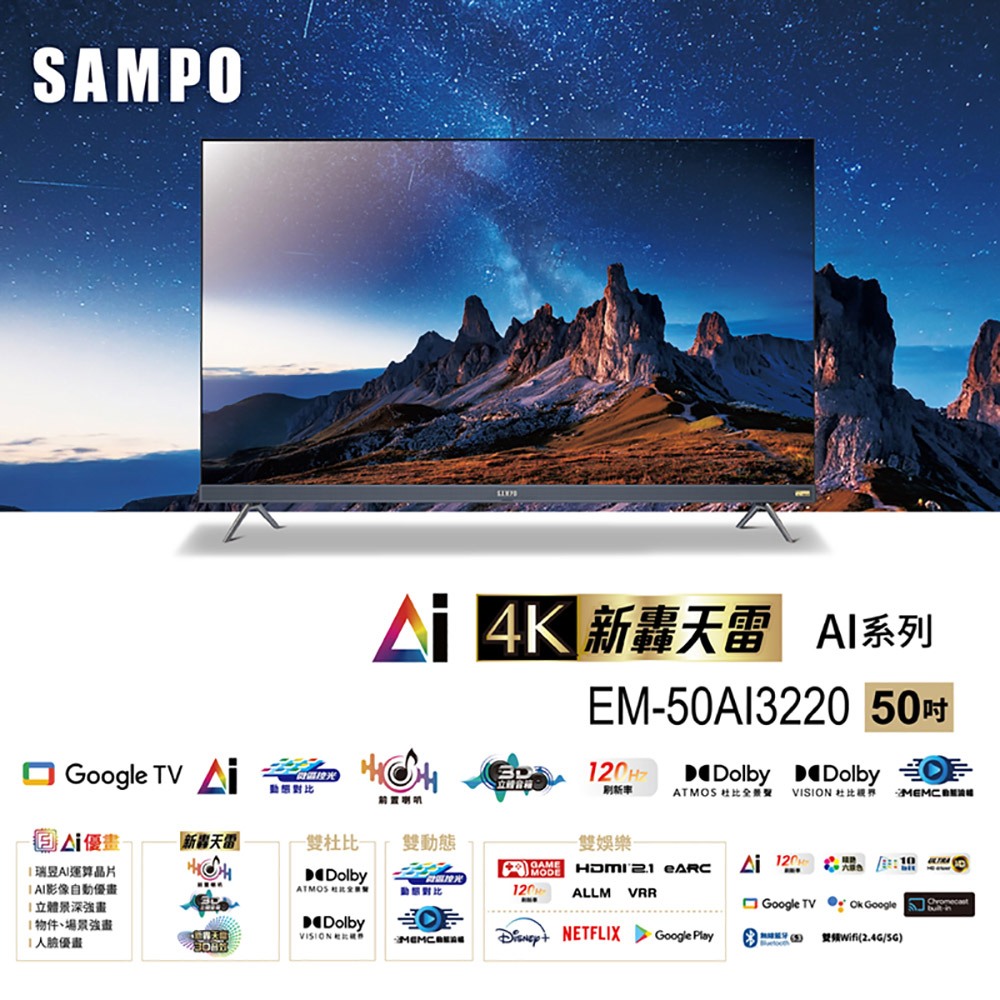 SAMPO聲寶 50型 UHD 4K AI優畫轟天雷聯網顯示器 EM-50AI3220台灣製-含基本安裝配送+舊機回收SAMPO聲寶 50型 UHD 4K AI優畫轟天雷聯網顯示器 EM-50AI3220台灣製-含基本安裝配送+舊機回收TVsSAMPO聲寶 官方直營店