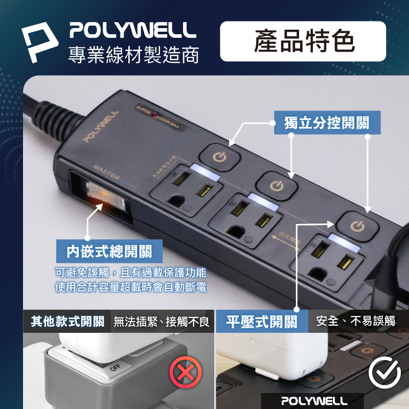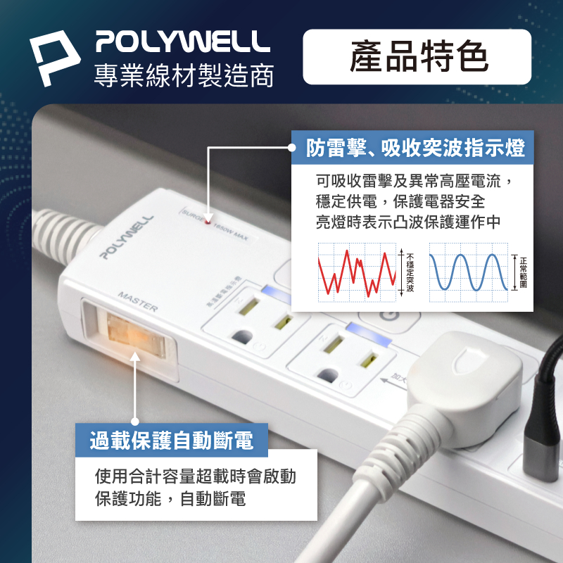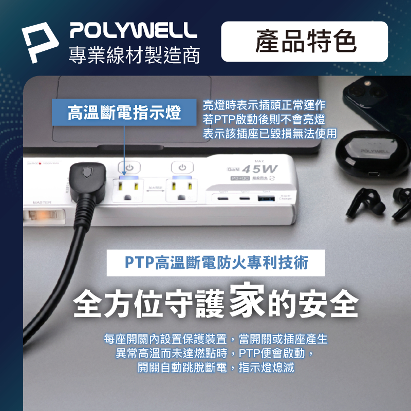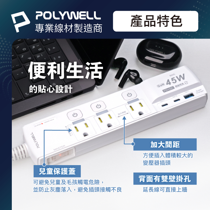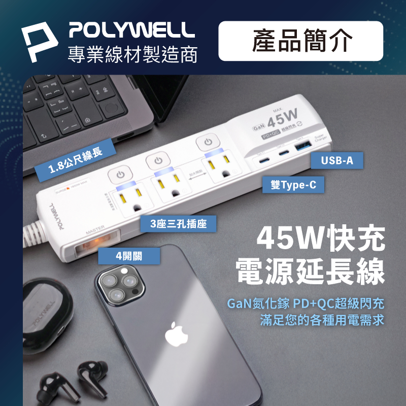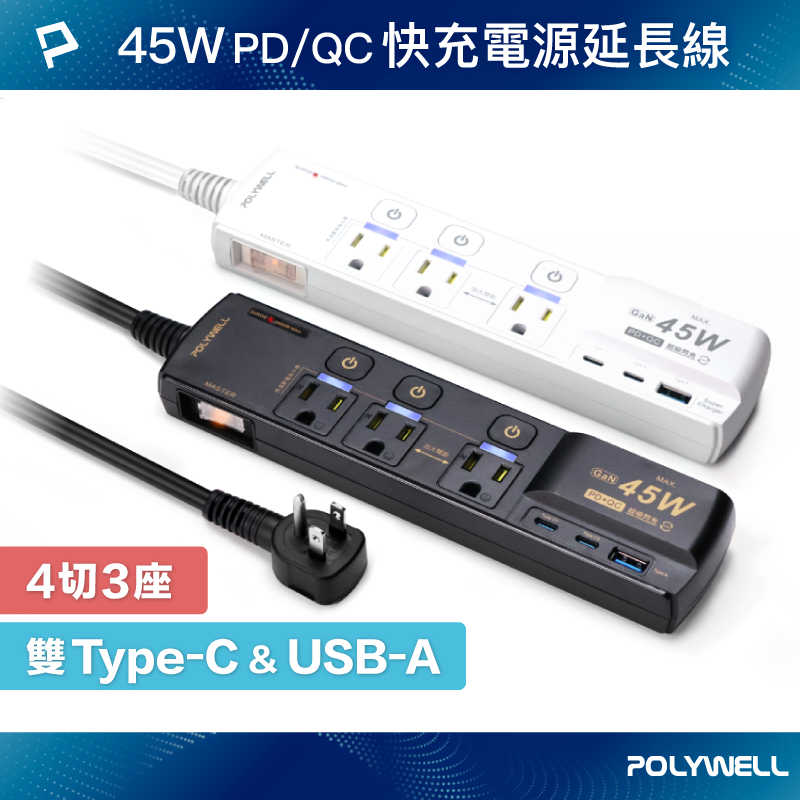 POLYWELL 45W快充電源延長線 4切3座 3P Type-C USB PD/QC快充 防突波 寶利威爾 台灣現貨黑色|白色Electric Sockets & Extension CordsPOLYWELL寶利威爾官方旗艦店