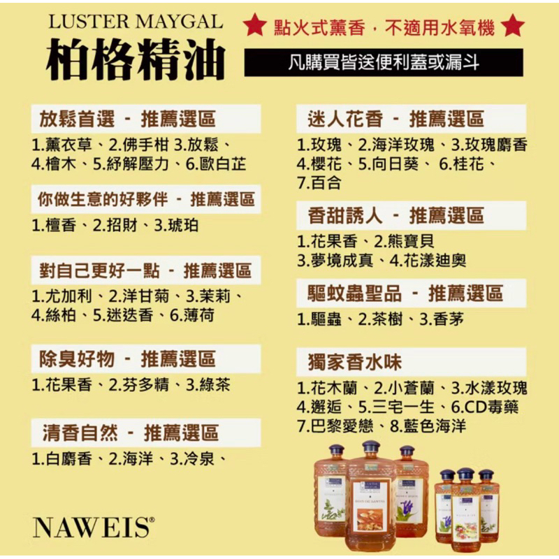 2000cc伯格精油 氣化式精油 法國巴黎原裝|可用空氣淨化機|有保險 安心使用 美格精油 送便利蓋或漏斗檀香(經典香味)|驅蟲(小白菊)|檜木|小蒼蘭(英國梨香水)|水漾玫瑰(克洛伊香水)|茶樹(殺菌好幫手)|邂逅(香奈浪漫香)|放鬆(複方中性香調)|冷泉(古龍香氣)|茉莉|櫻花|玫瑰(花中之后)|海洋(自然清香)|桂花(微甜香氣)|琥珀(濃郁香氣)|薄荷(清涼)|香茅(驅蟲好手)|綠茶(清新茶香)|絲柏(濃郁香氣)|尤加利(呼吸順暢)|薰衣草(舒眠首選)|花木蘭|歐白芷(舒眠放鬆)|白麝香(美體香氣)|佛手柑(香水佛手)|芬多精(柑橘清新)|花果香(果香甜)|熊寶貝(黃色寶貝)|迷迭香(草本香氣)|洋甘菊(甘菊花香)|向日葵(柔和的三宅一生)|薰加柑(失眠首選)|海洋玫瑰(浪漫經典)|玫瑰麝香|夢境成真(清香安娜蘇)|CD毒藥(迪奧經典)|巴黎愛戀(清香果香)|花樣迪奧|紓解壓力(舒眠NO.1)|招財進寶(紅包香氣)|三宅一生|藍色海洋|檸檬香茅(除臭驅蚊)|百合(野花清新)|其他香味下單(備註香味)Essential OilsNaweis納唯詩精油