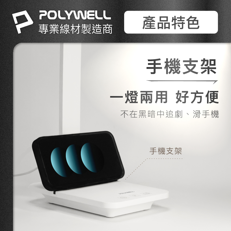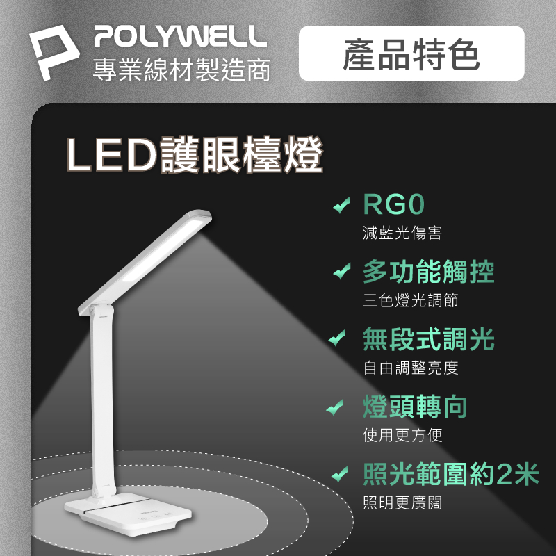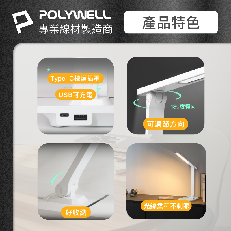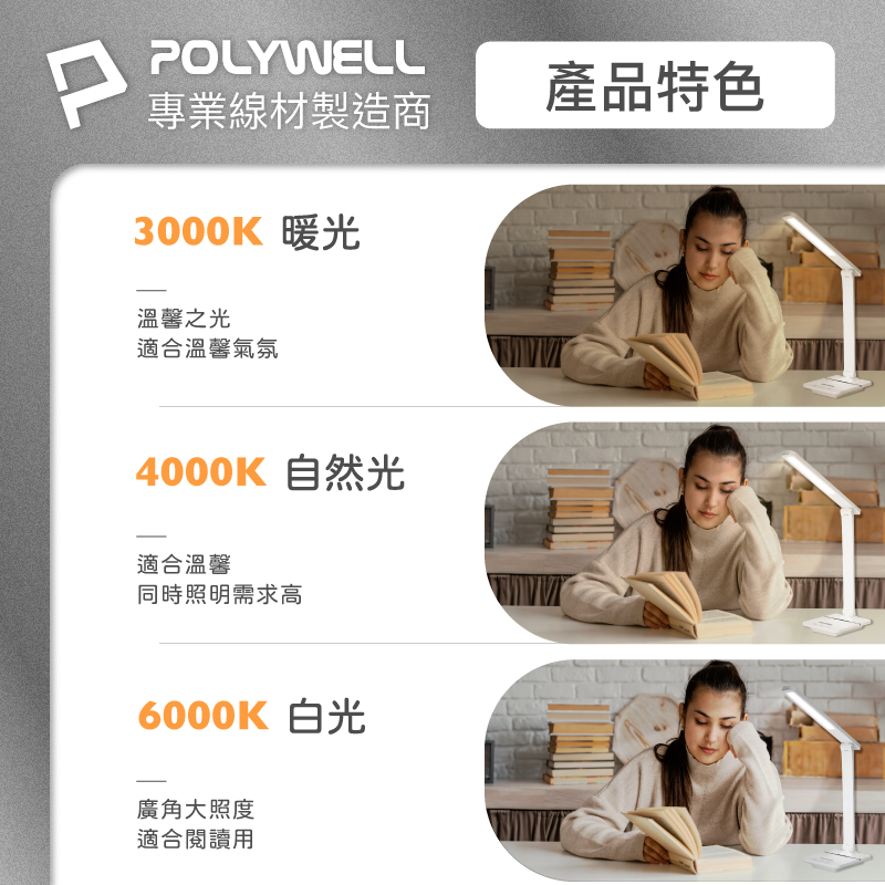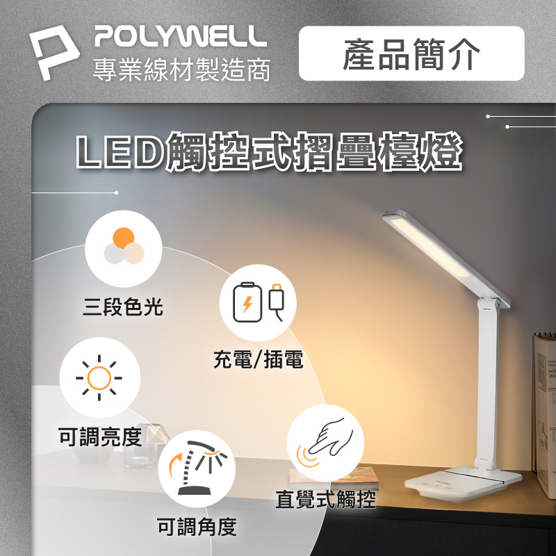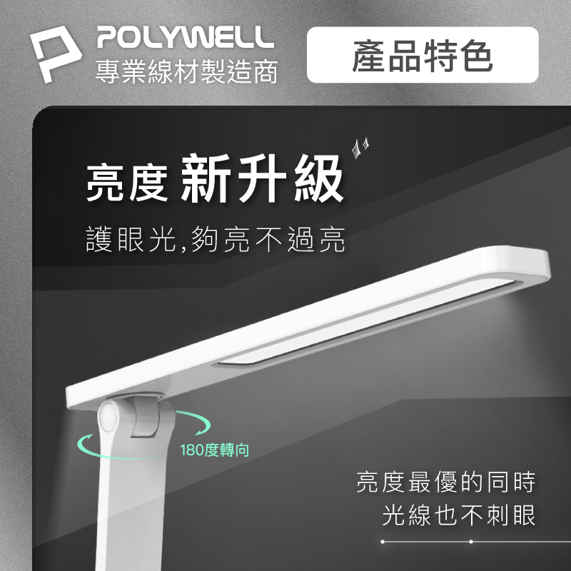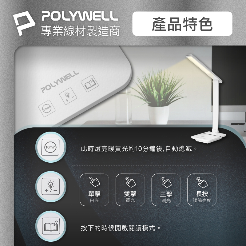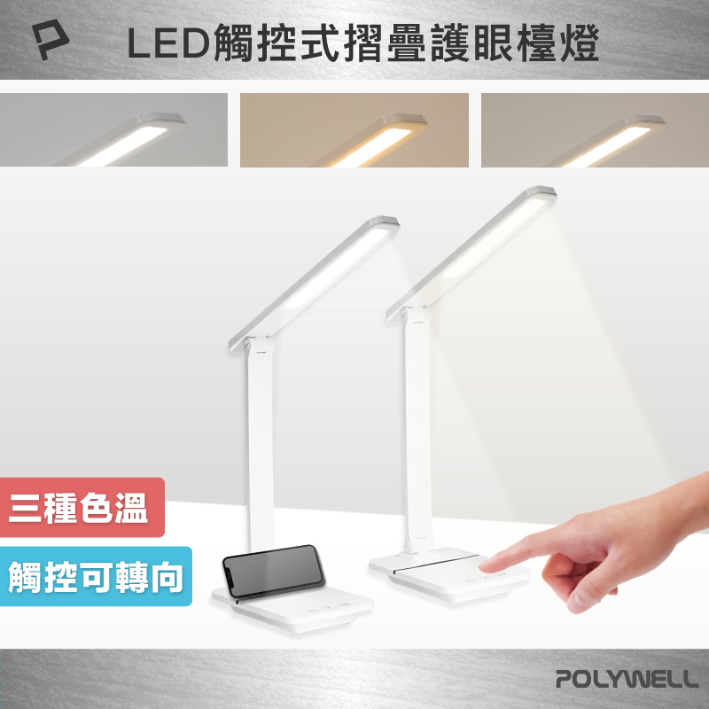 POLYWELL 觸控式LED護眼檯燈 USB供電 3種色溫可調 無段式亮度調整 光線柔和 寶利威爾 台灣現貨觸控式LED護眼檯燈POLYWELL寶利威爾官方旗艦店