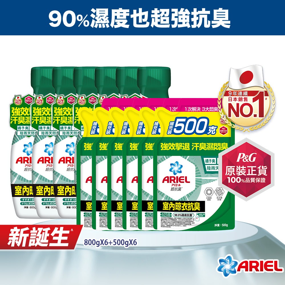 【ARIEL】抗菌抗臭洗衣精 6+6件組 (800gx6瓶+500gx6包)抗菌去漬/室內晾衣抗菌去漬(藍色)800gx6+500×6|室內晾衣(綠色)800gx6+500x6Laundry CareP&G寶僑旗艦店-幫寶適/一級幫/超薄乾爽/液體衛生棉/Ariel/官方旗艦店
