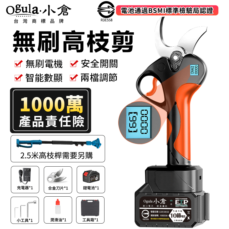 【Ogula小倉】電動剪刀 無刷果樹剪 高枝修枝剪刀 液晶數顯 安全開關 鋰電園林剪枝 電池認證BSMI:R3E558無刷數顯款【裸機】含配件+塑箱|無刷數顯款【五節一電】豪華配件+塑箱|無刷數顯款【十節一電】豪華配件+塑箱|BSMI認證電池【十節電芯】*1|【高枝桿1.3-2m】請下訂賣家宅配~|【高枝桿1.3-2.5m】請下訂賣家宅配|BSMI認證電池【十五節電芯】*1Gardening ToolsOgula小倉【官方旗艦店】