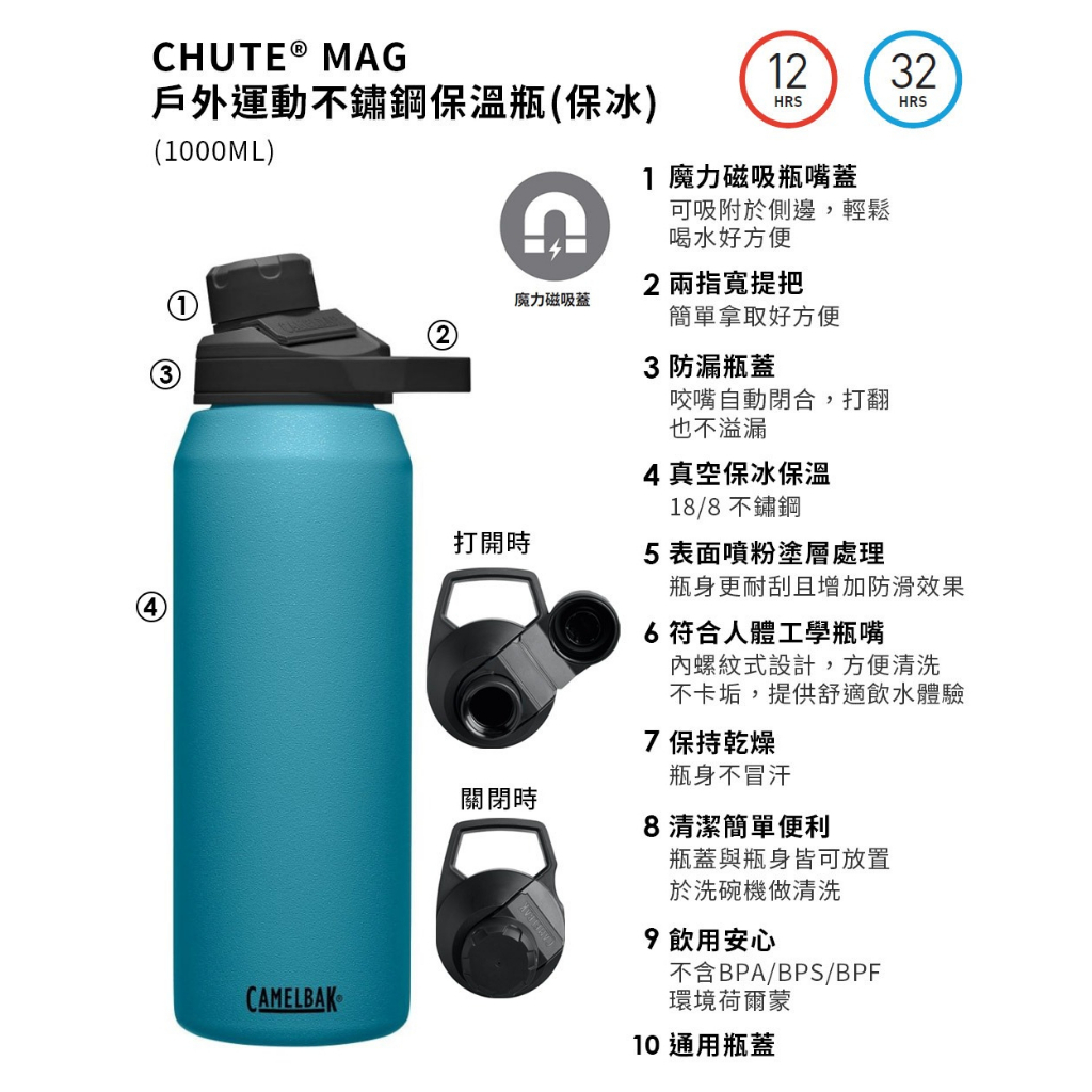 [Camelbak] 1000ml Chute Mag 不鏽鋼戶外運動保溫瓶 (保冰)灰綠|海軍藍|濃黑|經典白|北歐藍|日出橘|天空紫|冰綠|粉紫|驕傲出走|淺沙漠|灰藍|潟湖藍|野莓橘Water Bottles & AccessoriesOUTDOOR MAN 戶外用品店