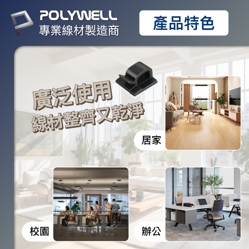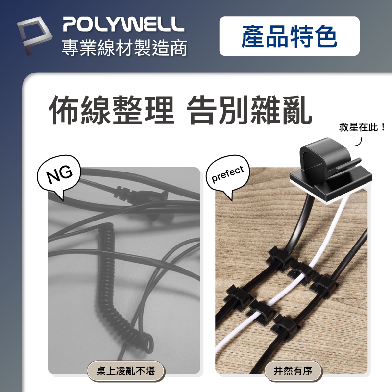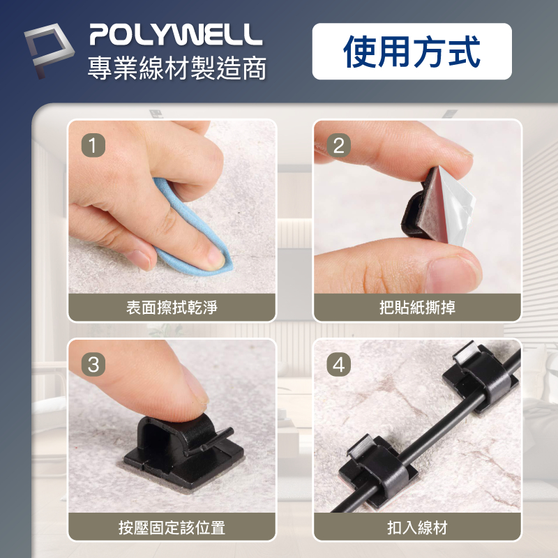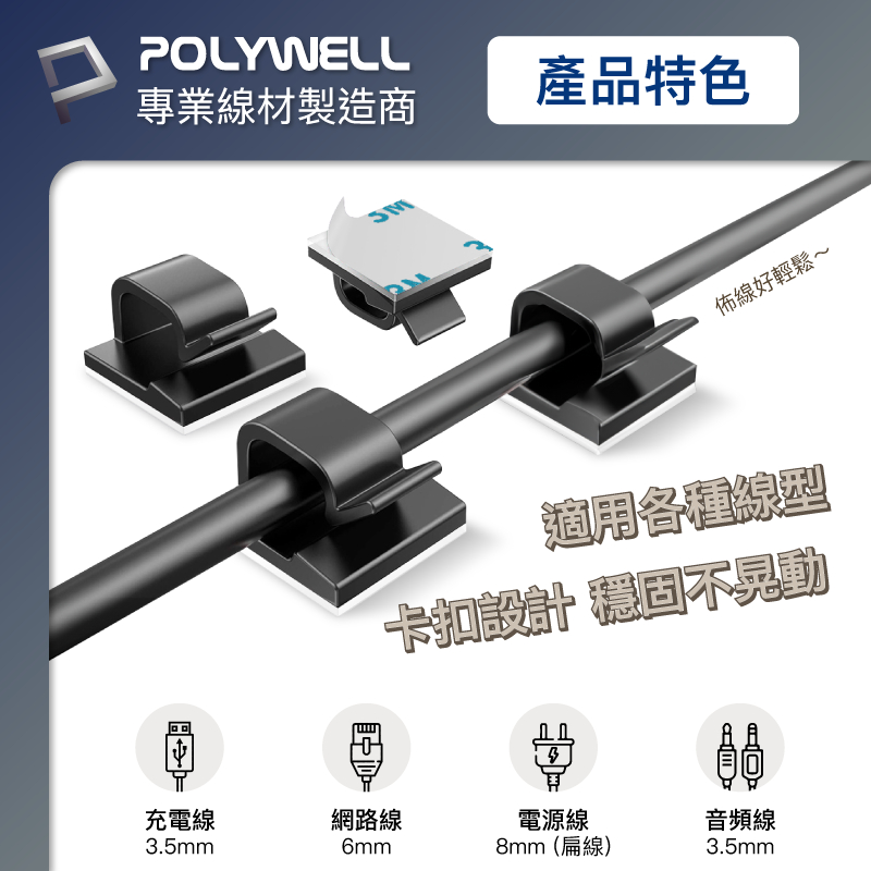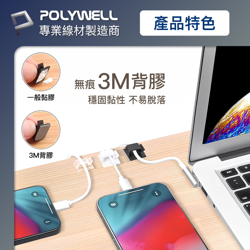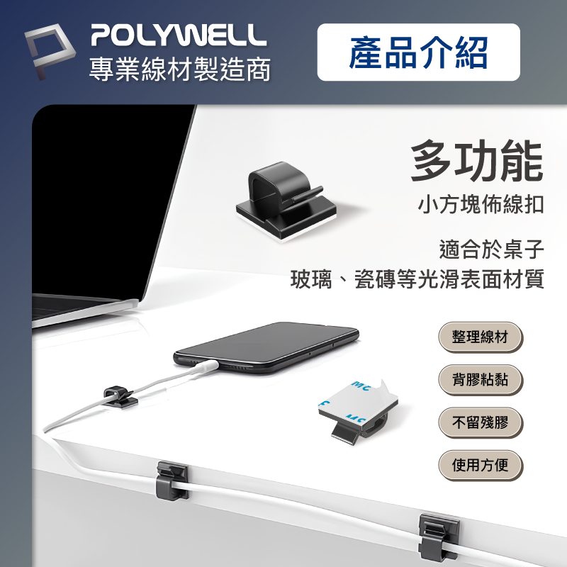 POLYWELL 方型黏貼式理線器 扣入式 三種顏色 適用不同粗細充電線 傳輸線 寶利威爾 台灣現貨