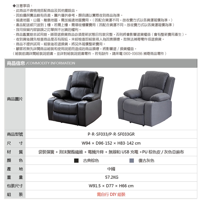 RICHOME 愛樂椅電動功能沙發 2色可選 領券現折 電動沙發 SF033復古灰(麻布材質)|古典棕SofasRICHOME 生活家居