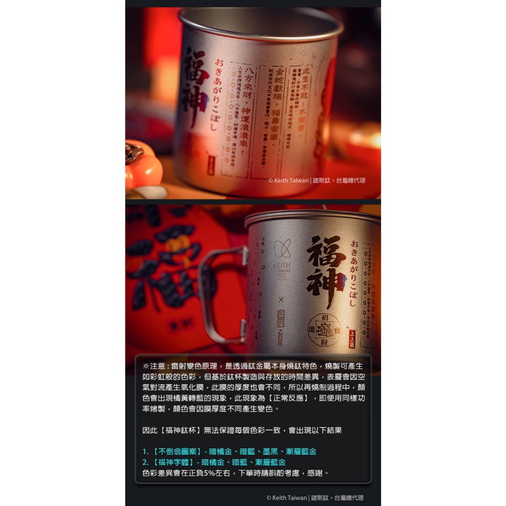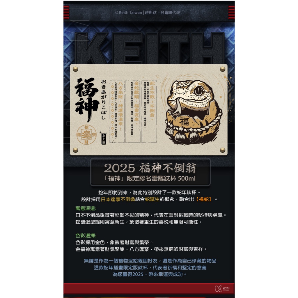 Keith 2025 新春限定組「福神不倒翁」雷雕鈦杯 500ml / Ti3205 純鈦杯子 鈦金屬杯 登山鈦杯 蛇年Keith 2025 新春限定組「福神不倒翁」雷雕鈦杯 500ml / Ti3205 純鈦杯子 鈦金屬杯 登山鈦杯 蛇年Cups, Mugs & GlassesSolar Life 索樂生活 | Keith鎧斯鈦台灣總代理