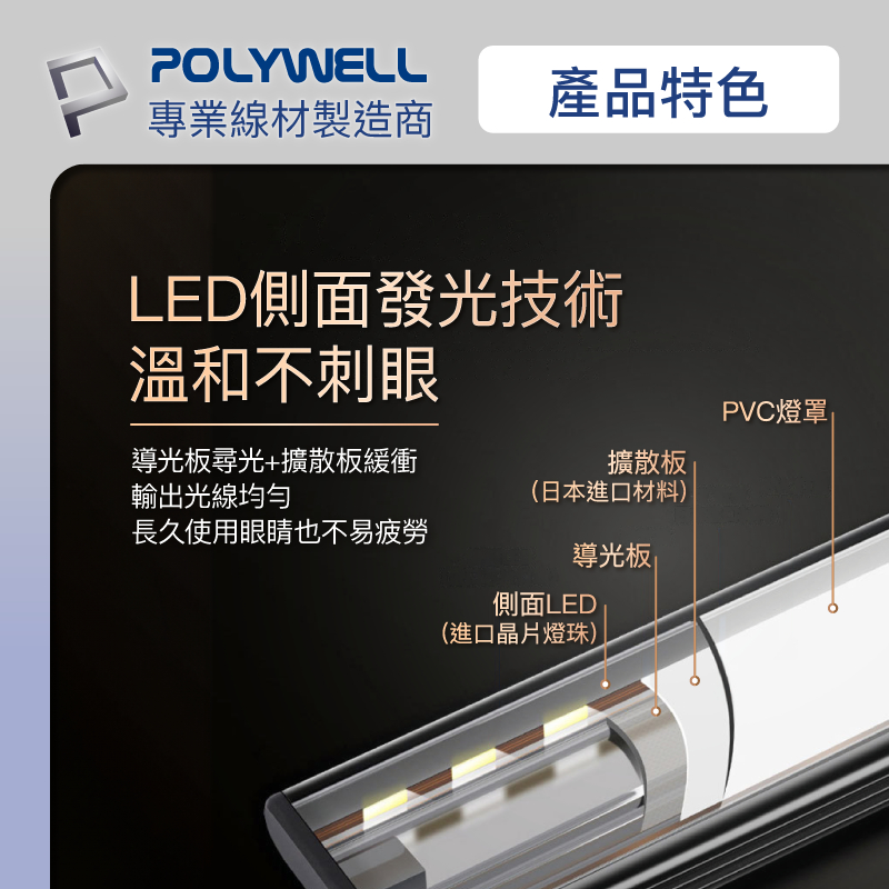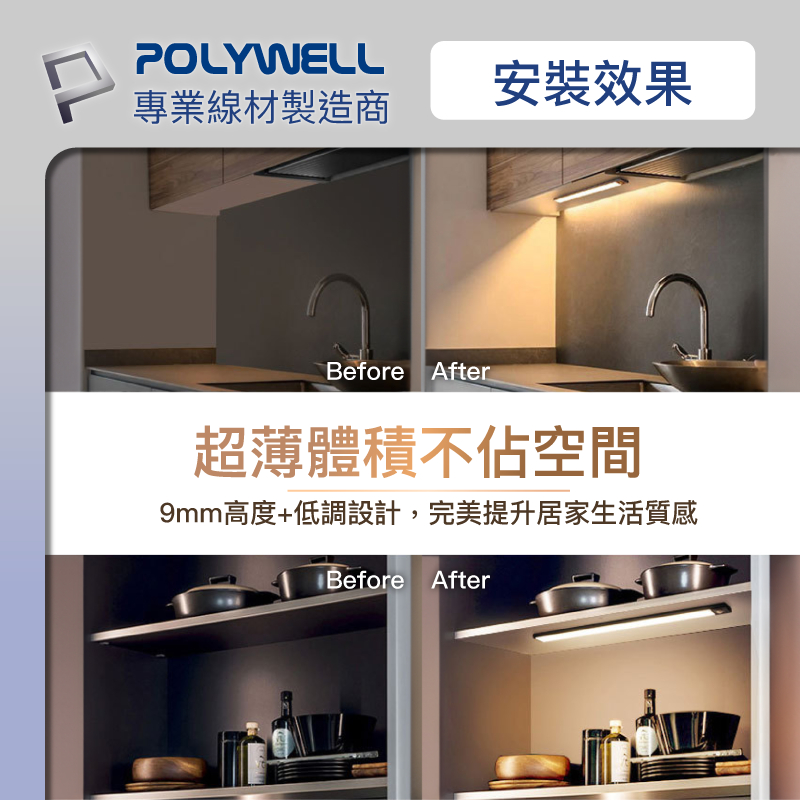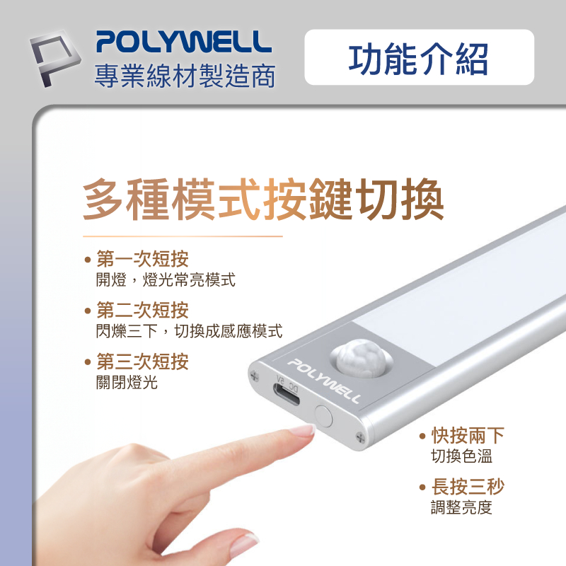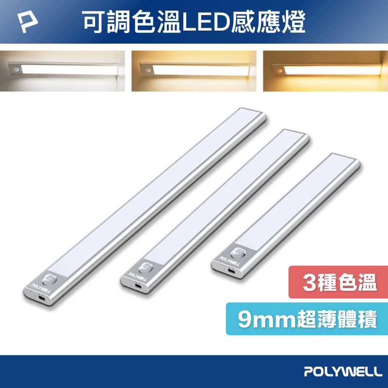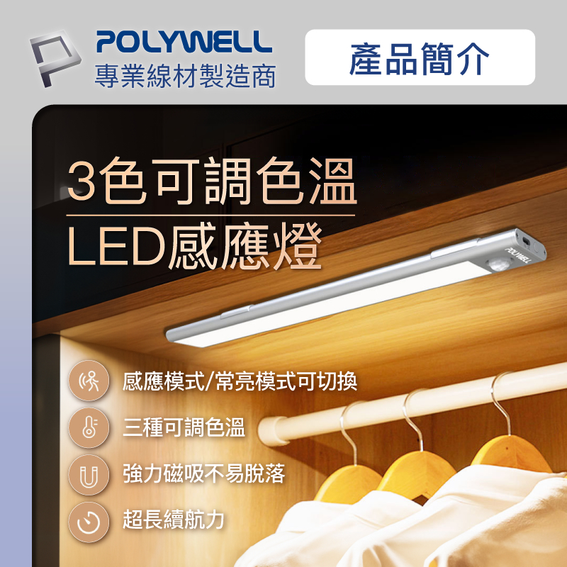 POLYWELL 磁吸式LED感應燈 超薄型設計 USB-C充電 人體感應 3種色溫 光線柔和 寶利威爾 台灣現貨20公分|30公分|40公分POLYWELL寶利威爾官方旗艦店