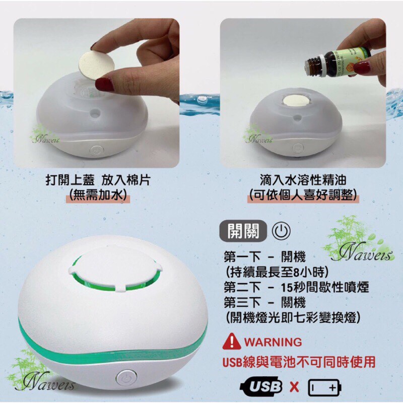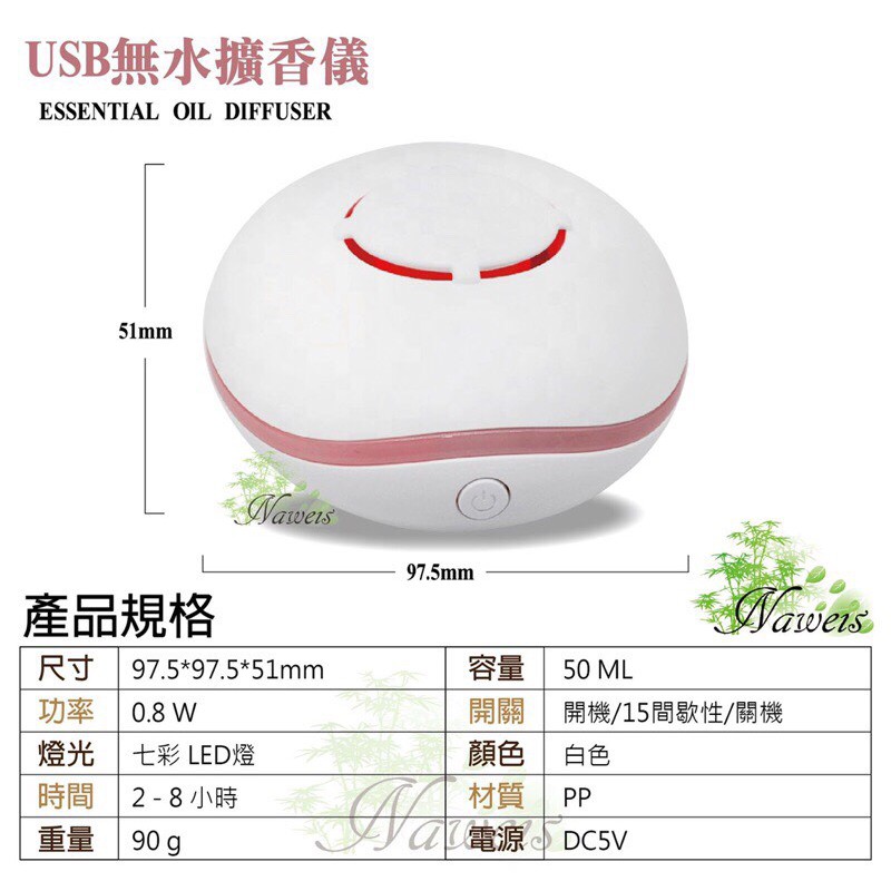 無水擴香 棉片擴香機 薰香機 隨身攜帶擴香 電池 USB 擴香器 迷你精油香氛機 七彩燈光 擴香儀 薰香機單機(含10片棉片)+2瓶Naweis油|單機(含10片棉片)|單機(含10片棉片)+5瓶Naweis油|宜莉爾油性精油10ml(備註香味|棉片10片x3組(共30片)Diffusers, Humidifiers & Oil BurnersNaweis納唯詩精油