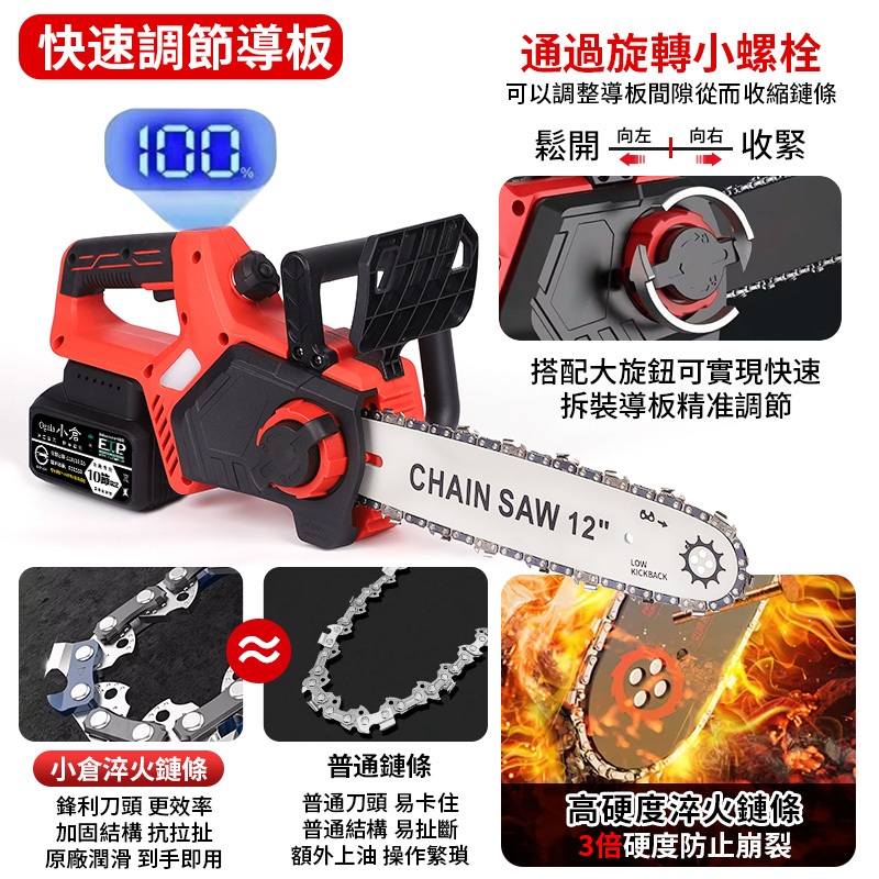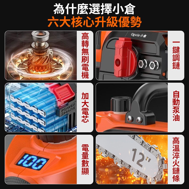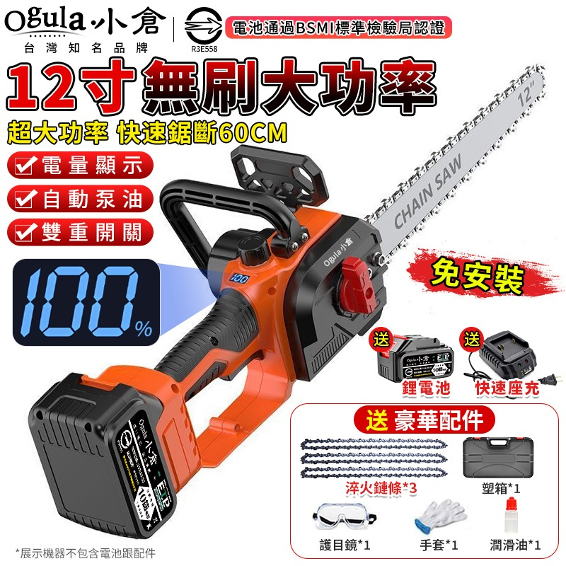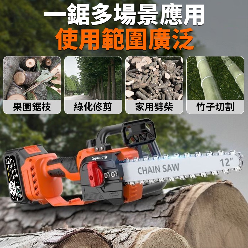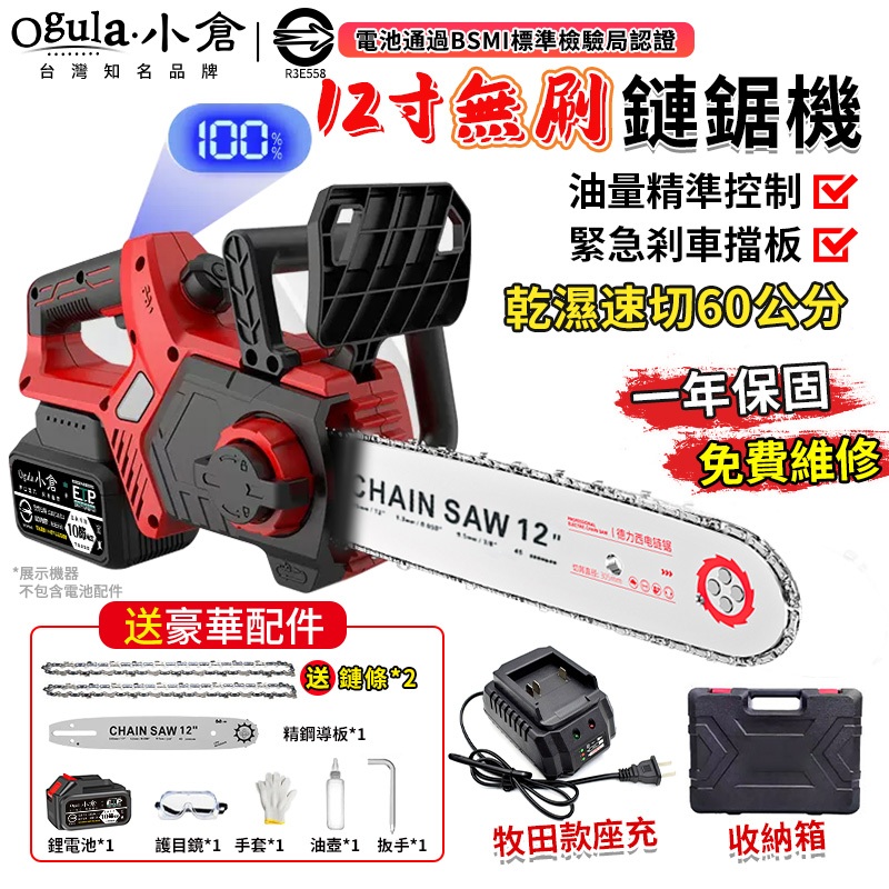 【Ogula小倉】鏈鋸機 12寸無刷電鏈鋸 電動鋸子【帶電量顯示】可鋸60公分 4280W大功率伐木鋸【10倍蝦幣回饋】BSMI認證合格電池-十節電芯*1|12吋電鏈鋸鏈條*3|BSMI認證電池【十五節電芯】*1|12寸無刷鏈鋸【裸機+2鏈條】緊急剎車|12寸無刷鏈鋸【十節一電+座充】2鏈條|12寸無刷鏈鋸【十節兩電+座充】2鏈條ToolsOgula小倉【官方旗艦店】