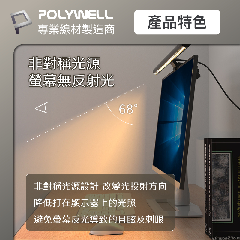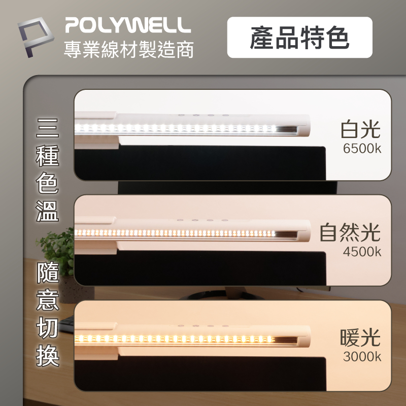 POLYWELL LED電腦螢幕掛燈 補光燈 USB-C供電 懸掛式支架 3種色溫可調 亮度可調 寶利威爾 台灣現貨黑色|白色POLYWELL寶利威爾官方旗艦店