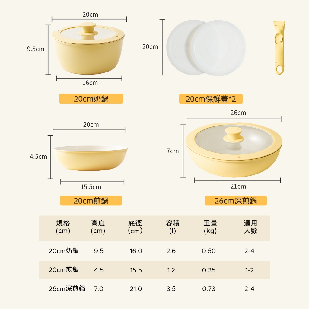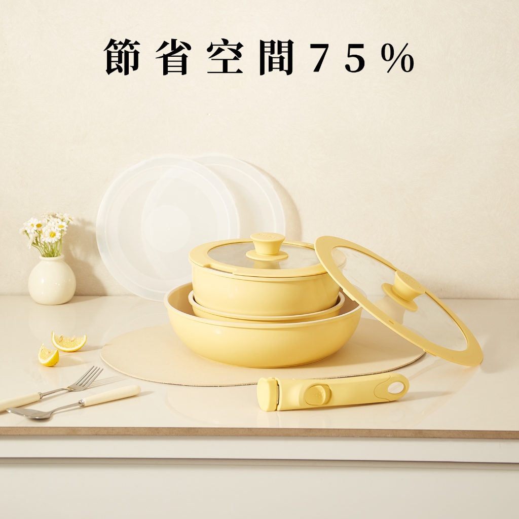 紅廚Redchef 陶瓷岩不沾鍋具8件組黄色 可拆式手柄+20/26CM平底鍋/煎炒鍋+20CM奶鍋 IH電磁爐適用8Pcs黃色(含1件手柄)PansRedchef