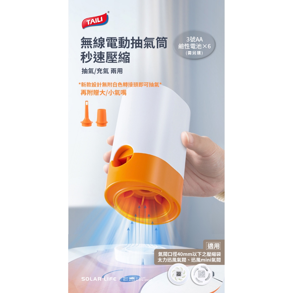 TAILI太力 壓縮袋無線電動抽氣筒/抽充兩用電泵 壓縮袋抽氣泵 充氣幫浦 無線電泵 電動抽氣機 真空抽氣機 抽氣手泵無線電池抽氣筒|手動抽氣筒|有線插電抽氣筒Wardrobe OrganizersSolar Life 索樂生活 | Keith鎧斯鈦台灣總代理