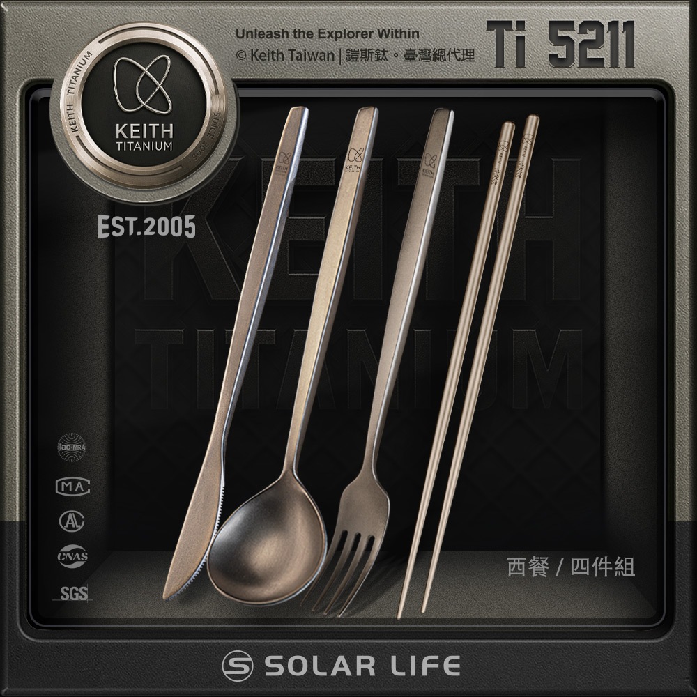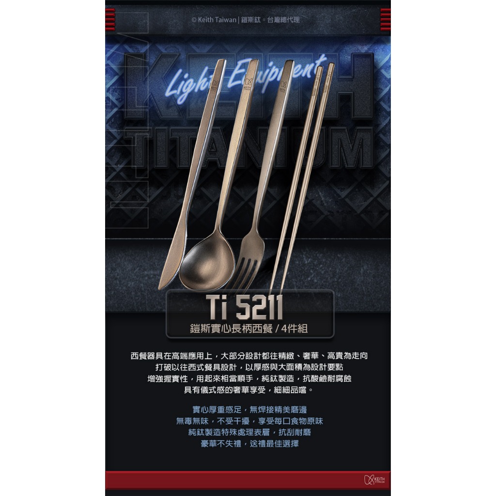 Keith 鎧斯實心長柄西餐具套裝4入組 鈦刀叉勺筷 / Ti5211 鈦環保筷 西式牛排刀 長柄甜品叉 長柄湯匙Keith 鎧斯實心長柄西餐具套裝4入組 鈦刀叉勺筷 / Ti5211 鈦環保筷 西式牛排刀 長柄甜品叉 長柄湯匙CutleriesSolar Life 索樂生活 | Keith鎧斯鈦台灣總代理