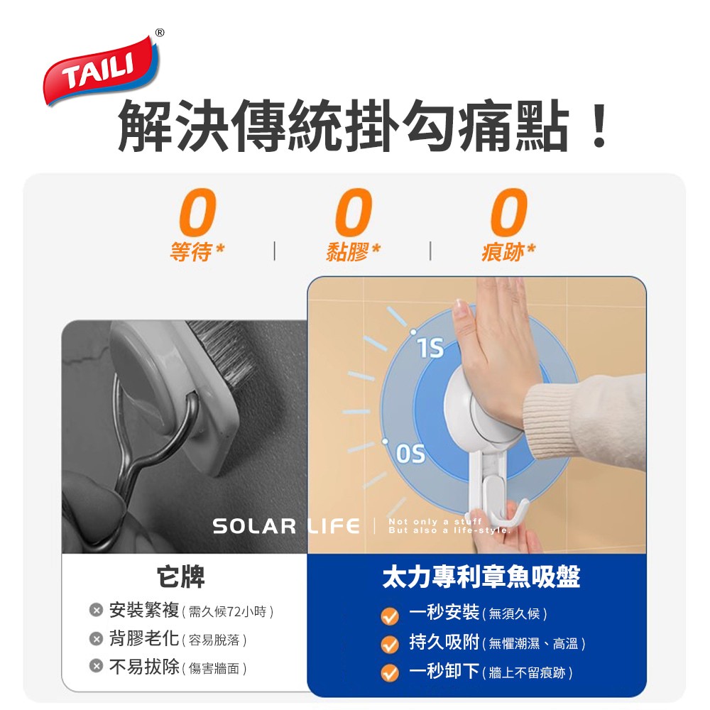 TAILI太力 黑科技真空吸盤衛浴廁所掛勾 蓮蓬頭支架 牙刷肥皂 置物盒掛壁架 無痕浴巾架 拖把架 馬桶刷 強力 吸盤刮鬍刀架|L型雙向掛勾2入組|4色炫彩掛勾/1組4入|斜鉤1入|斜鉤4入優惠盒裝|掛勾4入優惠盒裝|真空吸盤縮膜5勾掛架|掛勾1入|蓮蓬頭掛架|瀝水置物盒|肥皂盒/單層|肥皂盒/雙層|方型置物架|臉盆雙層掛勾|毛巾架10掛勾|拖把掛勾架|壁掛馬桶刷|三角置物架HooksSolar Life 索樂生活 | Keith鎧斯鈦台灣總代理