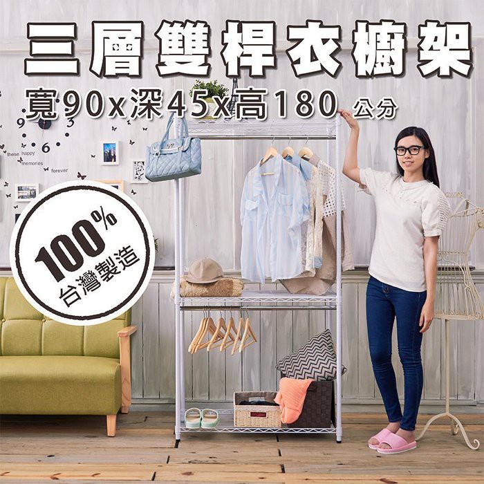比架王 輕型 90x45x180cm三層雙桿衣櫥層架(烤漆白) 鐵力士架 波浪架 衣物收納 換季 收納衣架比架王 輕型 90x45x180cm三層雙桿衣櫥層架(烤漆白) 鐵力士架 波浪架 衣物收納 換季 收納衣架WardrobesParity 比架王居家生活館