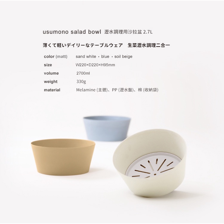 【日本ideaco】usumono 瀝水調理用沙拉盆(附收納袋)-2.7L-3色可選茶棕|淺藍|沙白Bowlsnicegoods 生活好東西