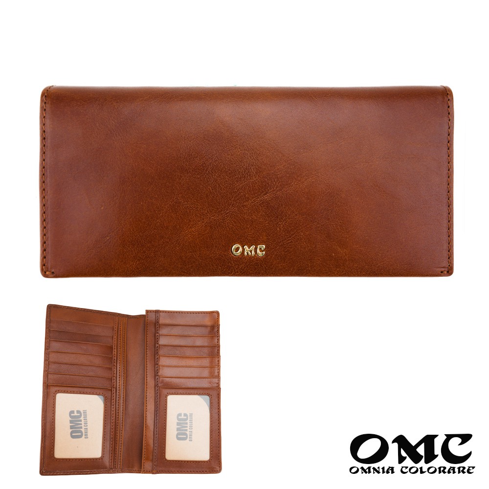 【OMC】義大利植鞣革金屬標12卡2照拉鍊牛皮長夾-棕色