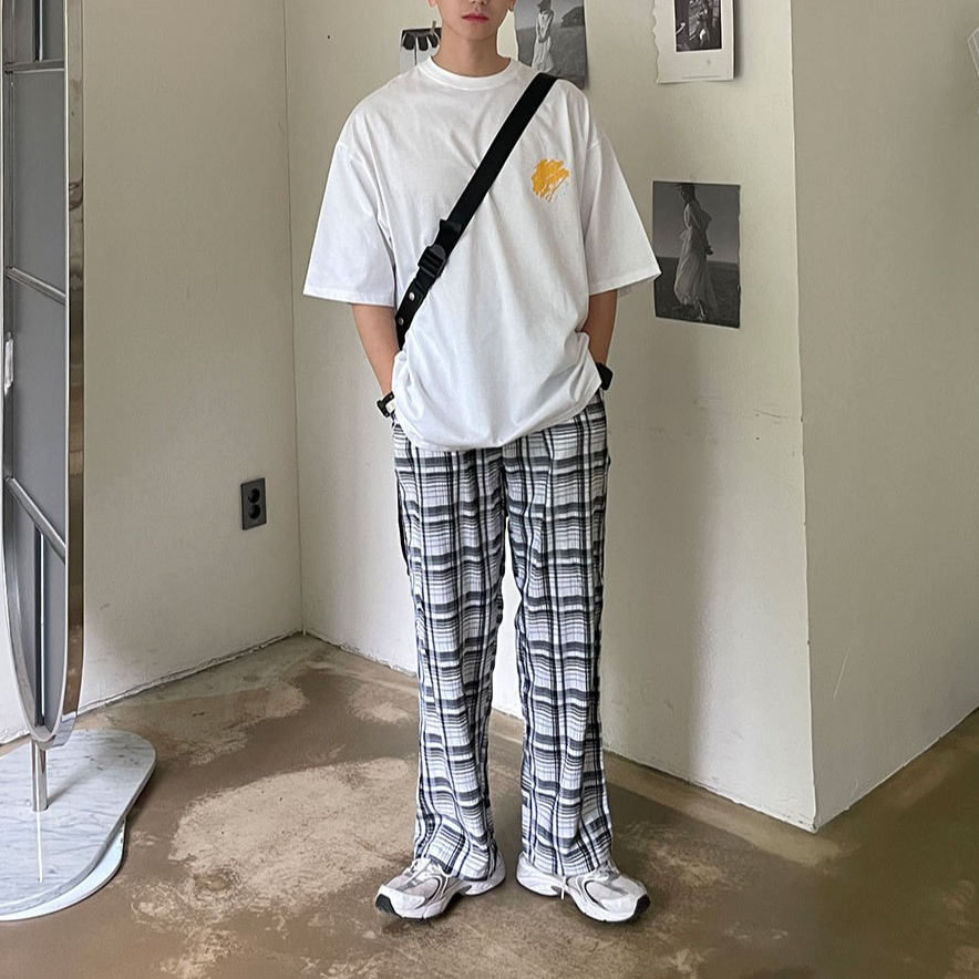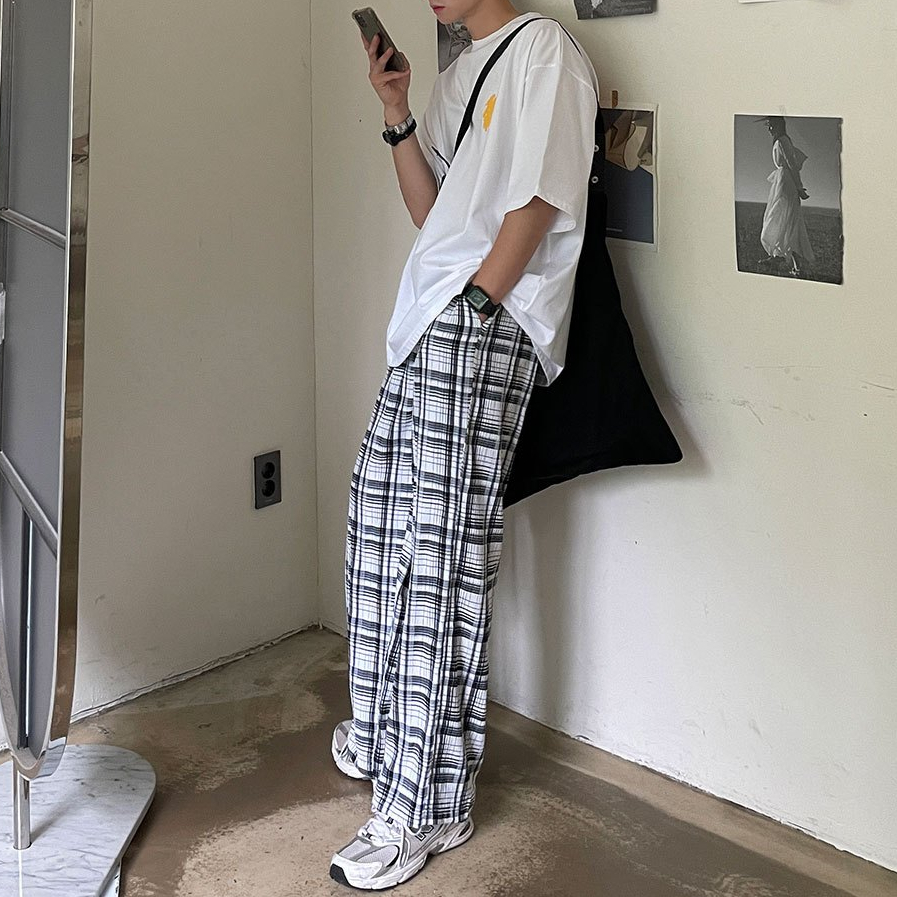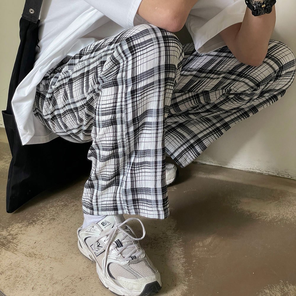 【QIAO】格紋長褲 黑白格紋 直筒 闊腿褲 輕棉麻 男生長褲 格子褲 長褲 復古百搭 韓國空運M|L|XLPantsQIAO 潮人服飾旗艦店