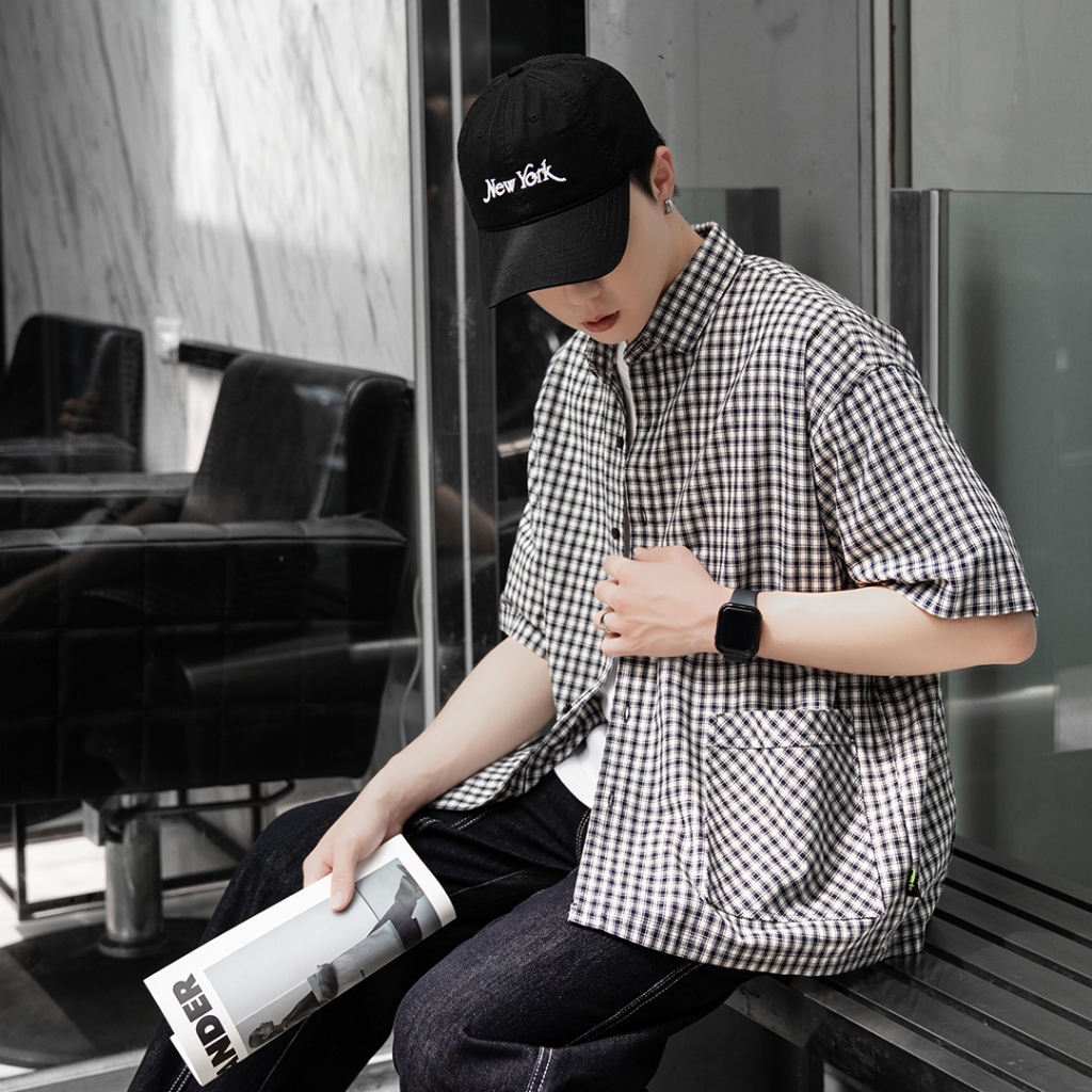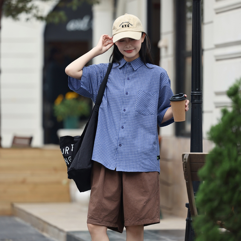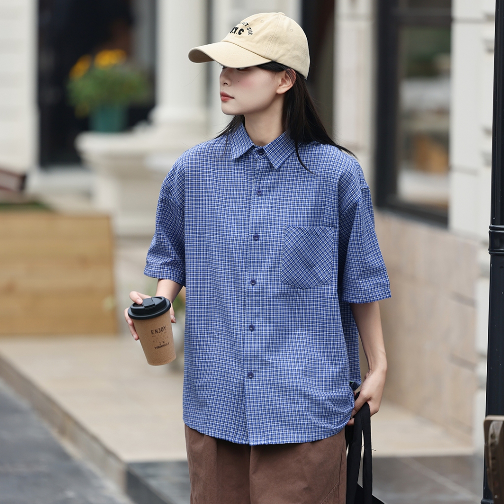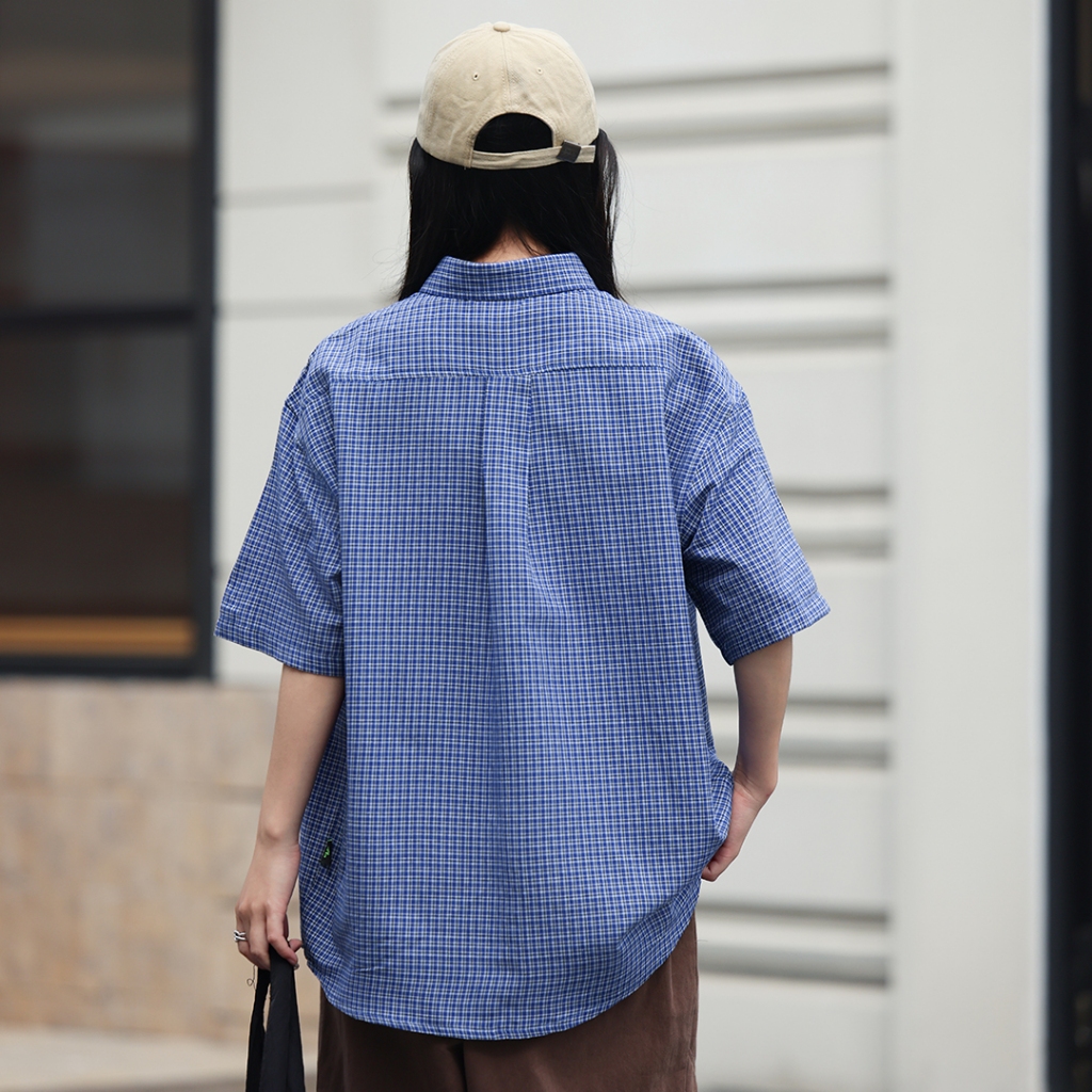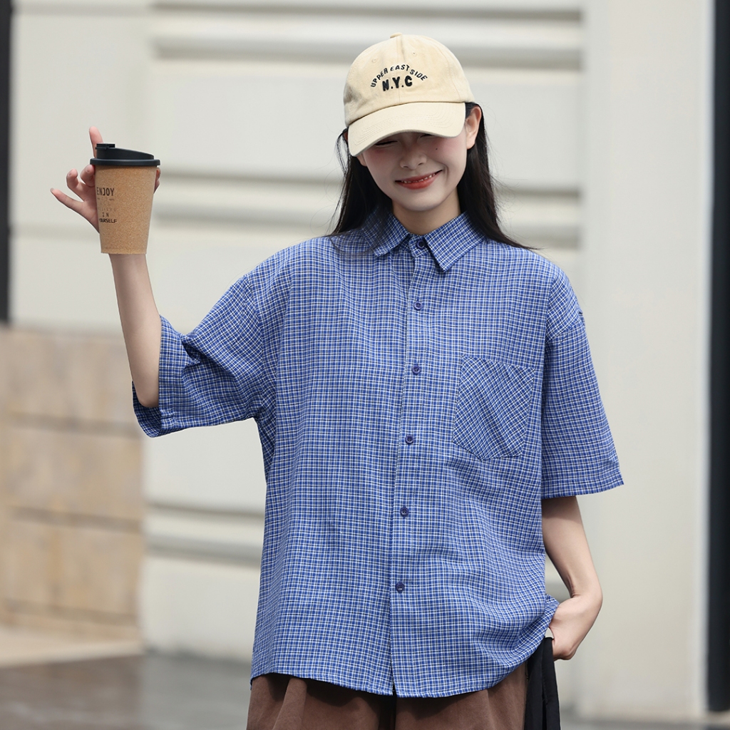 【QIAO】日系藍調 小格紋襯衫 學院風襯衫 短袖襯衫 情侶裝 寬鬆襯衫 格子襯衫 襯衫 男友風襯衫 夏季襯衫男L|XL|2XL|MShirtsQIAO 潮人服飾旗艦店