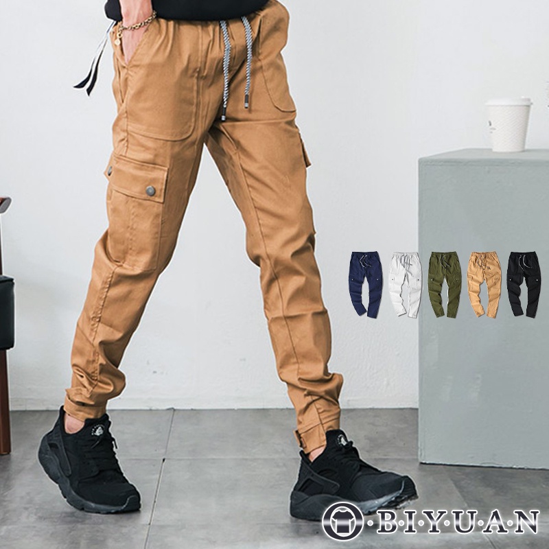 【OBIYUAN】魔鬼氈束口 休閒褲 工裝 多口袋 縮口褲 彈性 長褲 工作褲 5色【T88902】