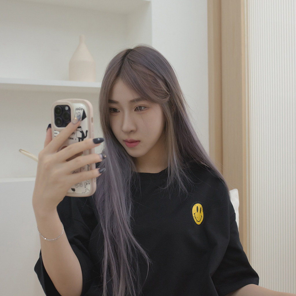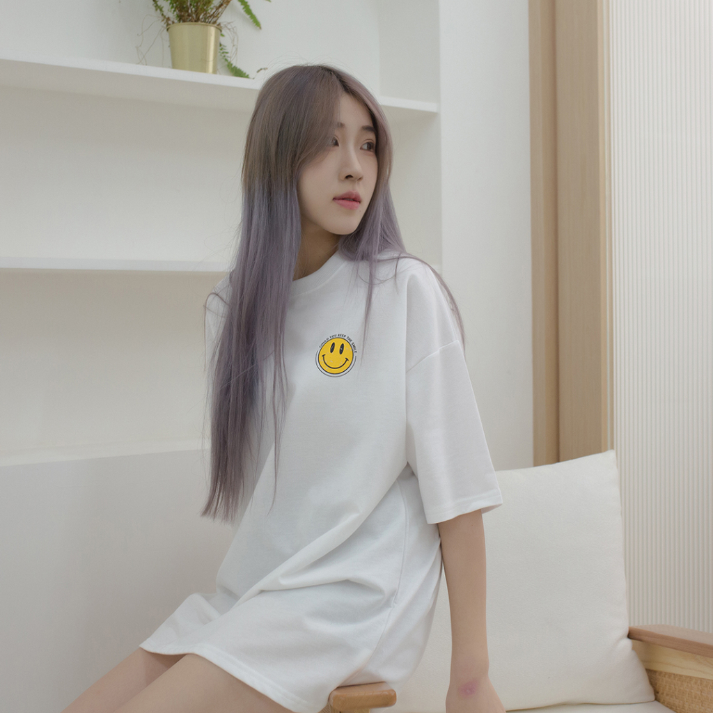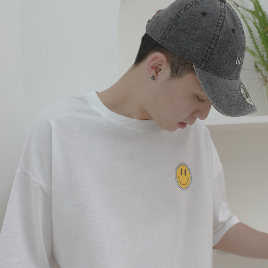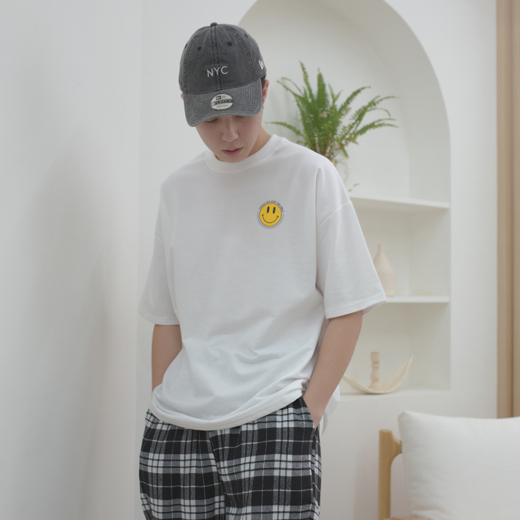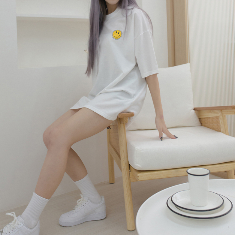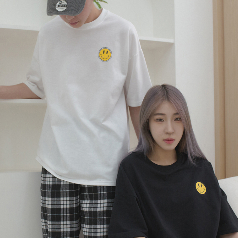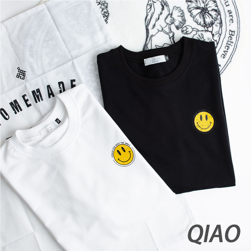 QIAO 韓國新貨 復古印刷 小微笑 升級細絨棉 落肩 寬鬆 細絨棉 五分T 情侶 穿搭 T恤 長版T 短T 男短T 女黑色,M|黑色,L|白色,M|白色,LT-ShirtsQIAO 潮人服飾旗艦店