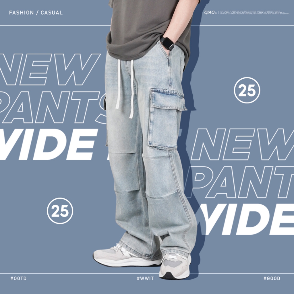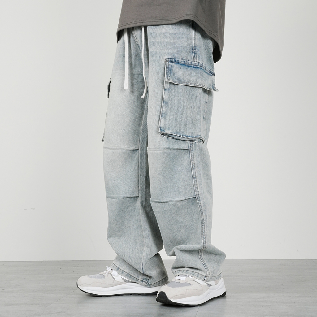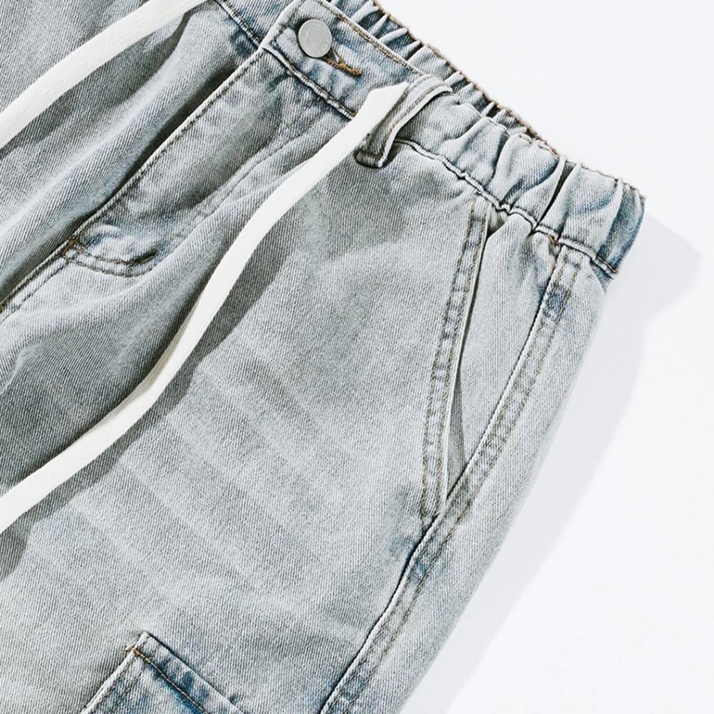 【QIAO】2682 立體褶痕 鬆緊褲頭 傘兵工裝牛仔褲 日系 水洗 淺色 直筒褲 牛仔 工作褲 長褲 褲子M|L|XL|XXLCargoQIAO 潮人服飾旗艦店