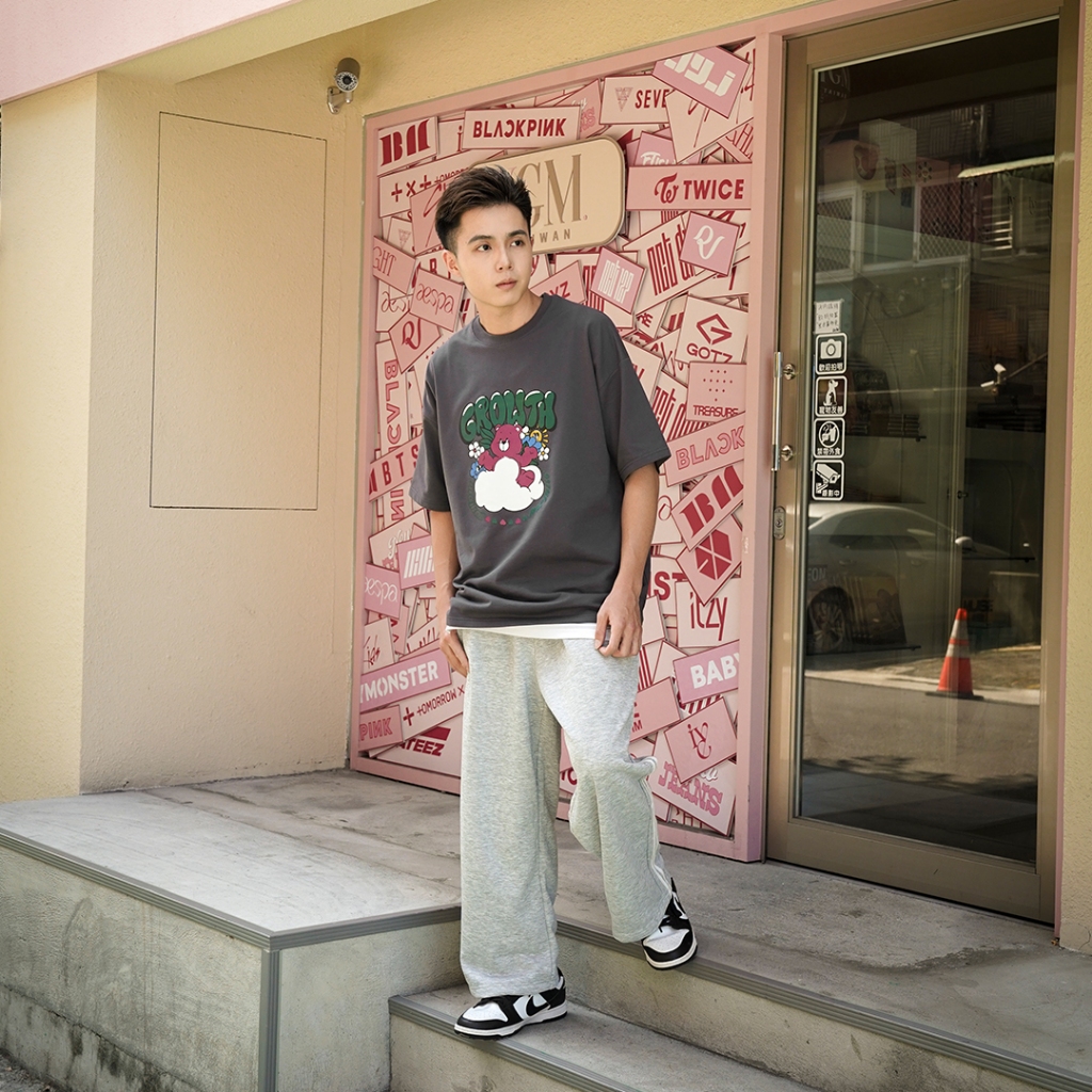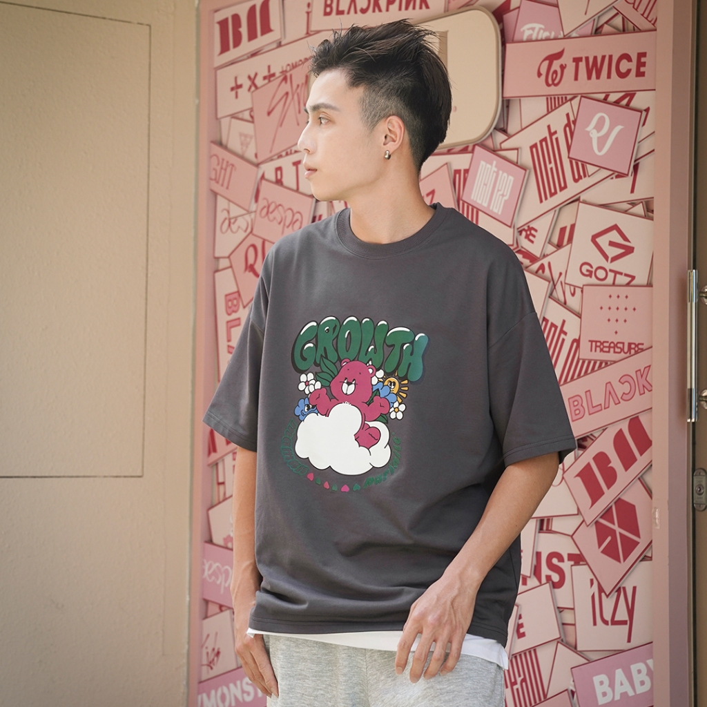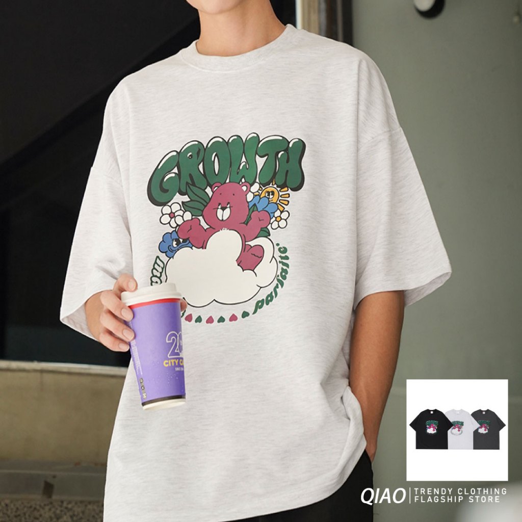 【QIAO】實拍命定款 漂浮的熊熊 細絨棉 韓系 情侶裝 落肩 五分袖 寬鬆 T恤 短袖 短T 男裝 男生衣服 可愛衣服混合白,M|混合白,L|黑色,M|黑色,L|灰色,M|灰色,LT-ShirtsQIAO 潮人服飾旗艦店