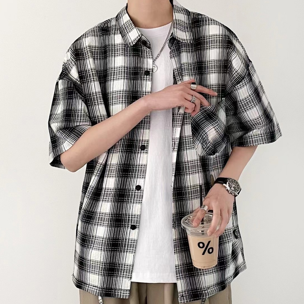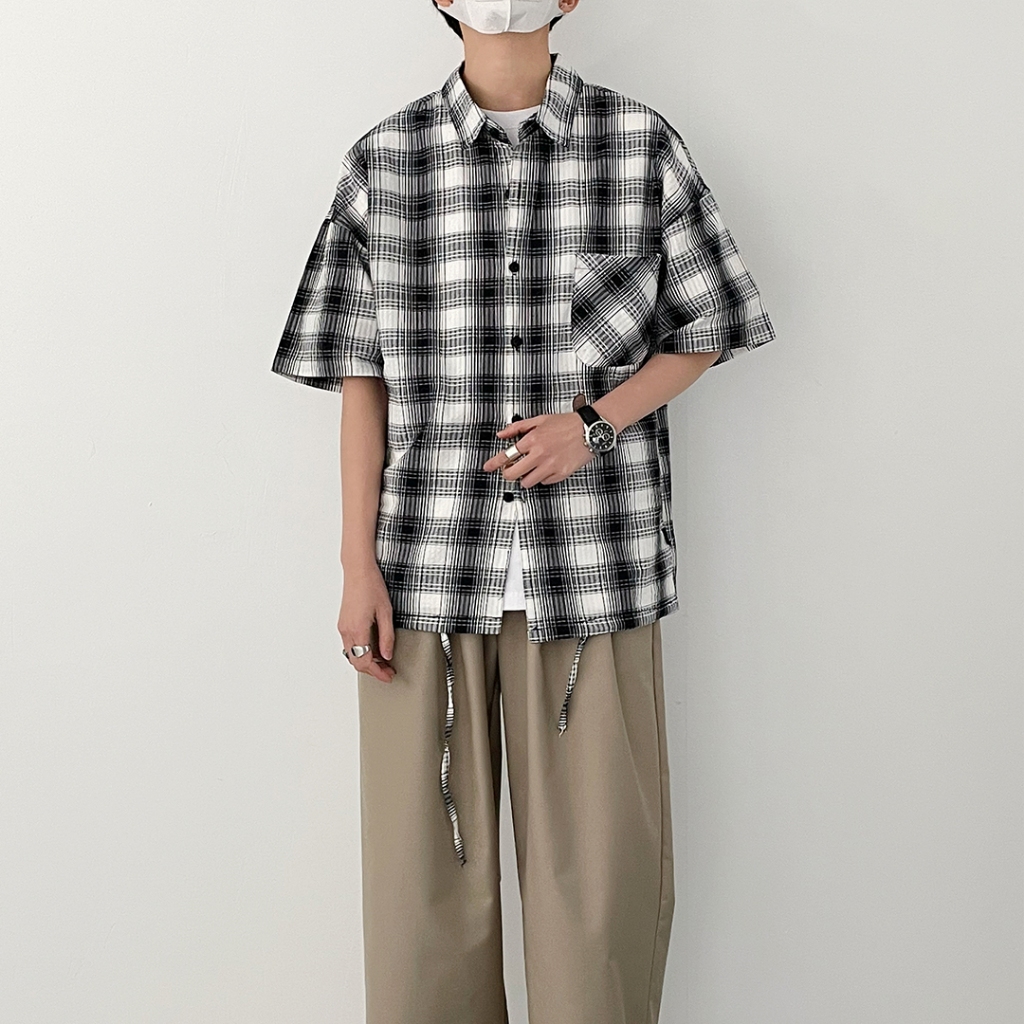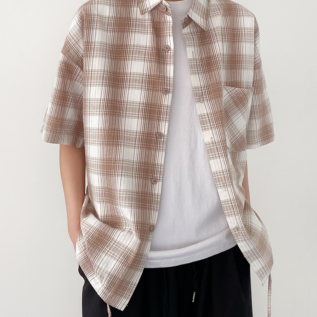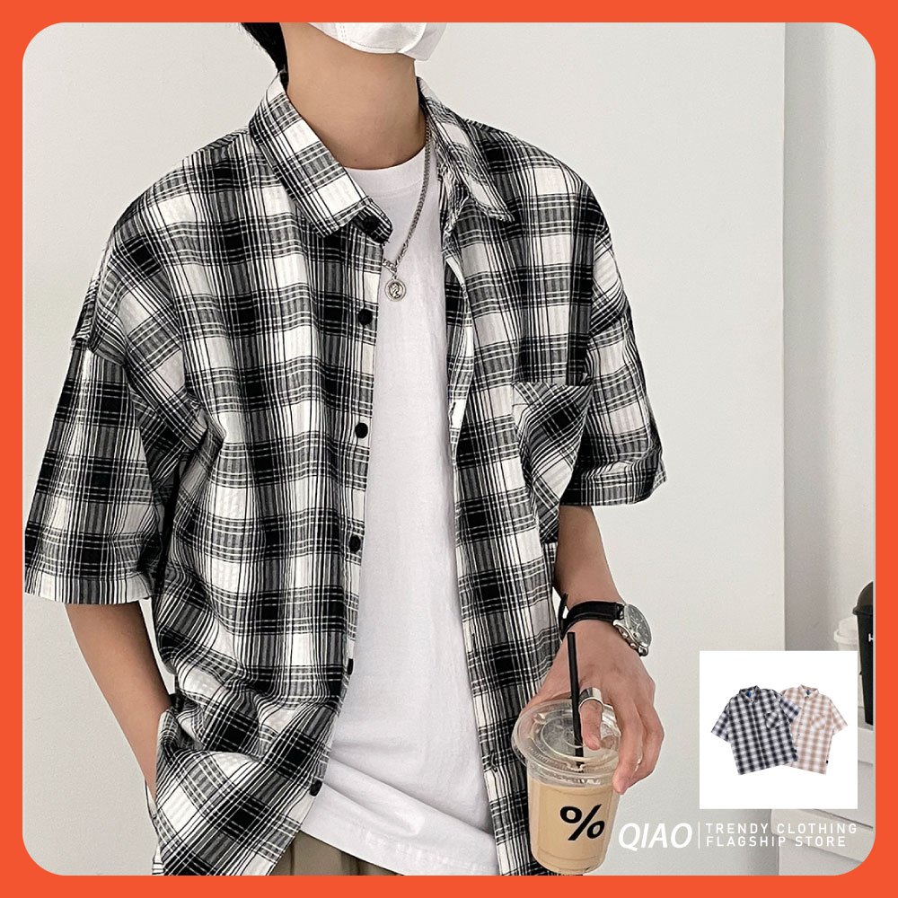 【QIAO】韓感抽繩 格紋襯衫 短袖襯衫 寬鬆襯衫 工作襯衫 格子襯衫 襯衫 穿搭 男友風襯衫 夏季襯衫男 休閒襯衫黑色,M|黑色,L|黑色,XL|黑色,2XL|杏色,M|杏色,L|杏色,XL|杏色,2XLShirtsQIAO 潮人服飾旗艦店