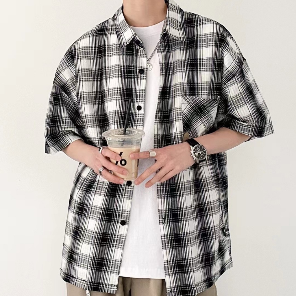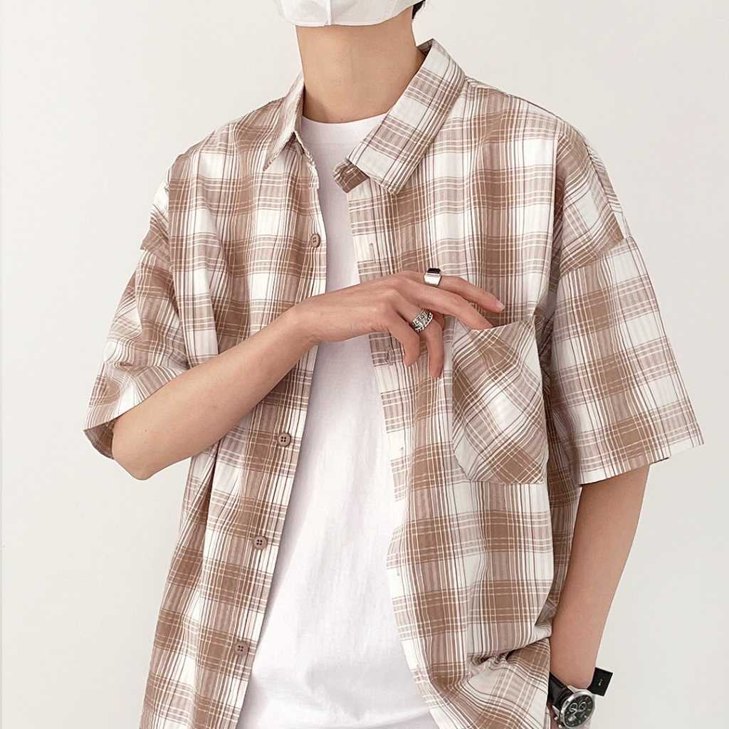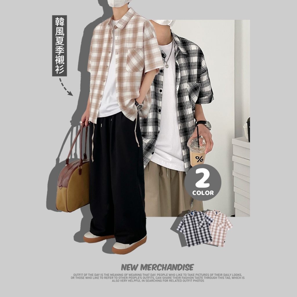 【QIAO】韓感抽繩 格紋襯衫 短袖襯衫 寬鬆襯衫 工作襯衫 格子襯衫 襯衫 穿搭 男友風襯衫 夏季襯衫男 休閒襯衫黑色,M|黑色,L|黑色,XL|黑色,2XL|杏色,M|杏色,L|杏色,XL|杏色,2XLShirtsQIAO 潮人服飾旗艦店