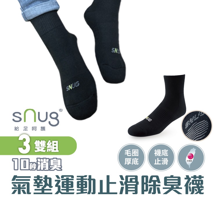 sNug【厚底】【動能氣墊運動襪止滑款3雙組】透氣 吸汗 除臭襪 止滑襪 運動襪 職棒球星愛用推薦 10秒除臭 台灣製黑色,22-24|黑色,25-27sNug給足呵護-科技健康襪/台灣製/官方直營