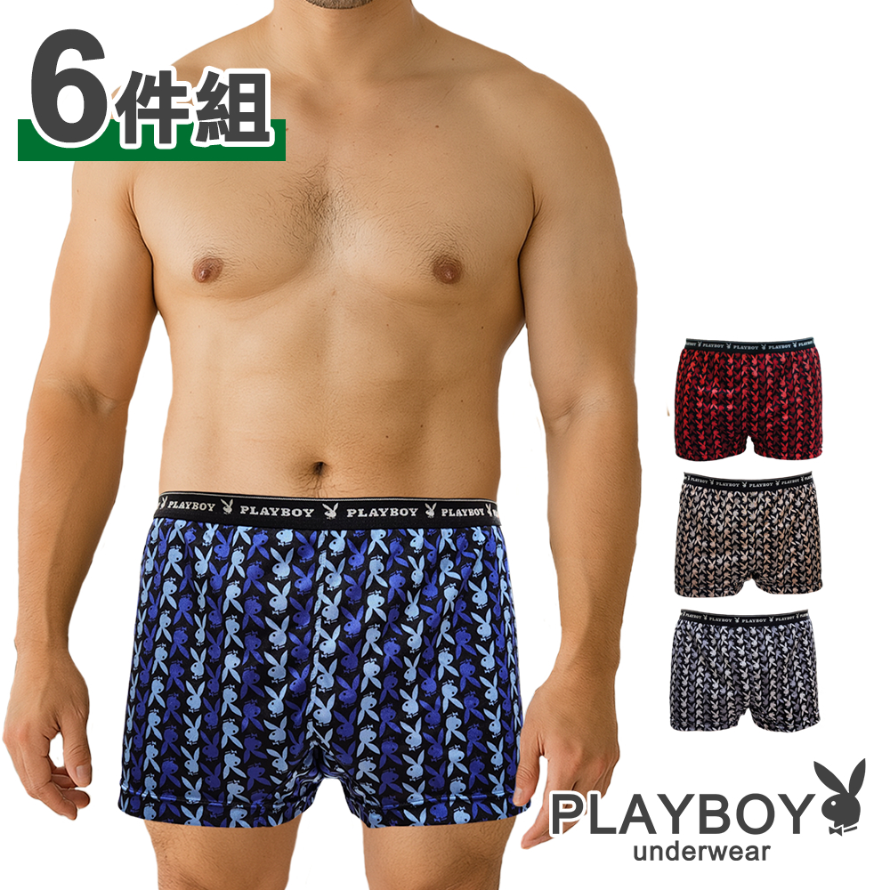 PLAYBOY|滿版LOGO印花絲光平口內褲 四角內褲|6件組M|L|XL|XXLUnderwearPLAYBOY_英殷國際