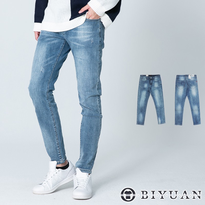 【OBIYUAN】牛仔褲 大彈力 窄管 質感 小雪花 刷色 抓痕 韓版 長褲 【P2193】淺藍28|淺藍30|淺藍32|淺藍34|淺藍36OBIYUAN