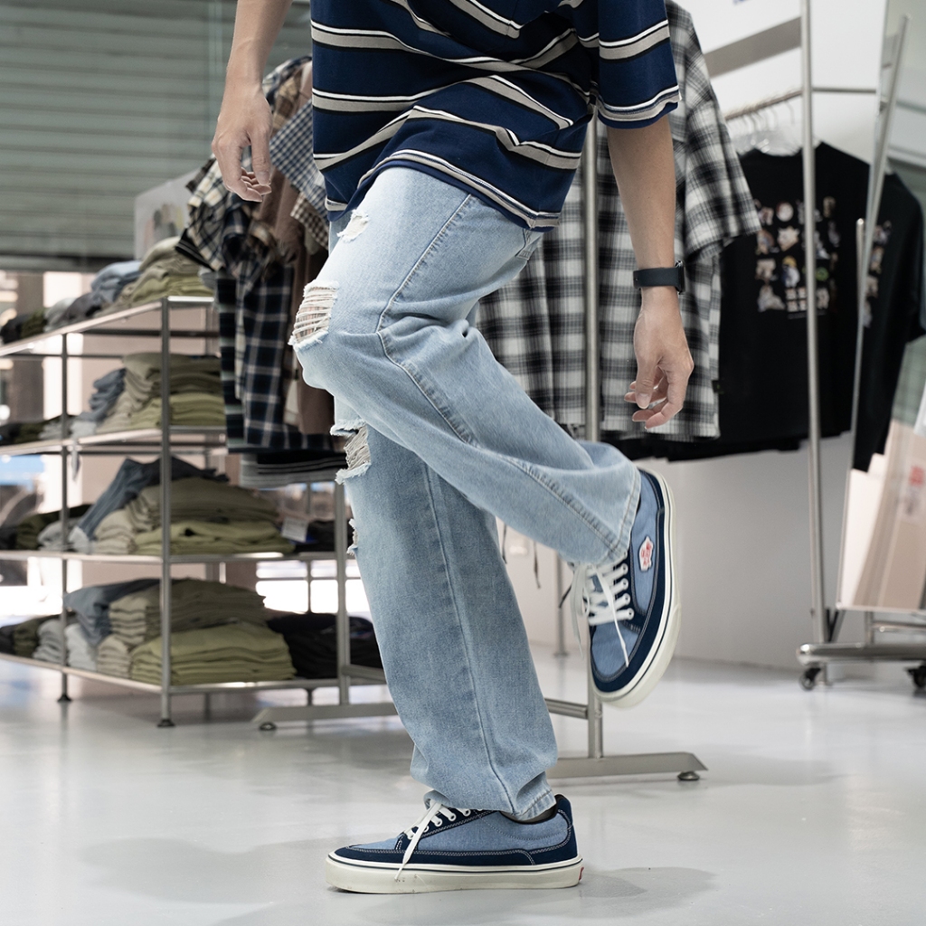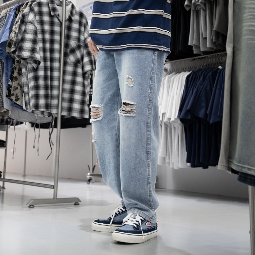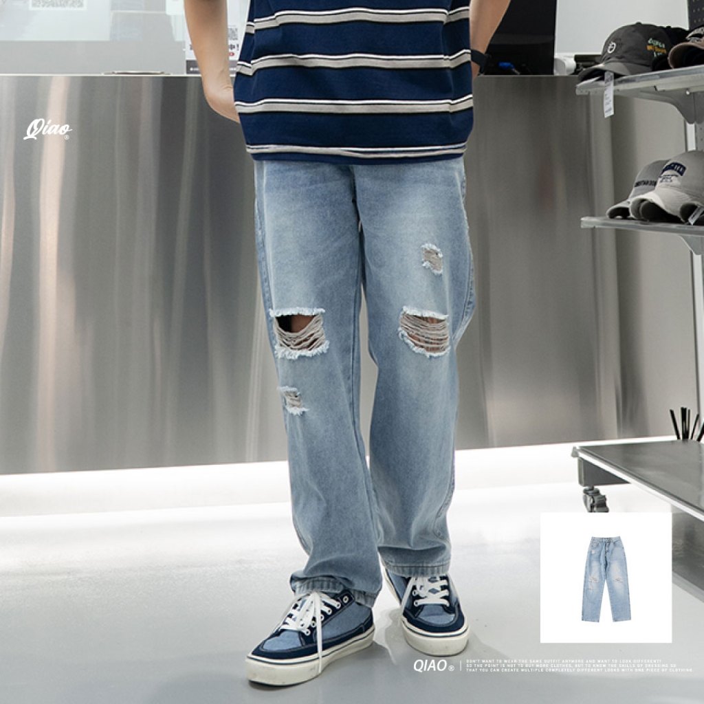 QIAO 水洗刷破 淺藍牛仔褲 直筒褲 基礎 寬褲 破褲 素色 長褲 休閒長褲 牛仔褲M|L|XL|2XLQIAO 潮人服飾旗艦店
