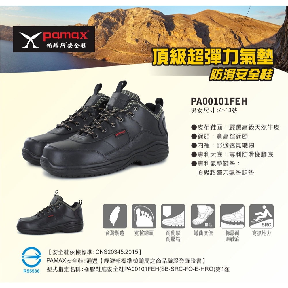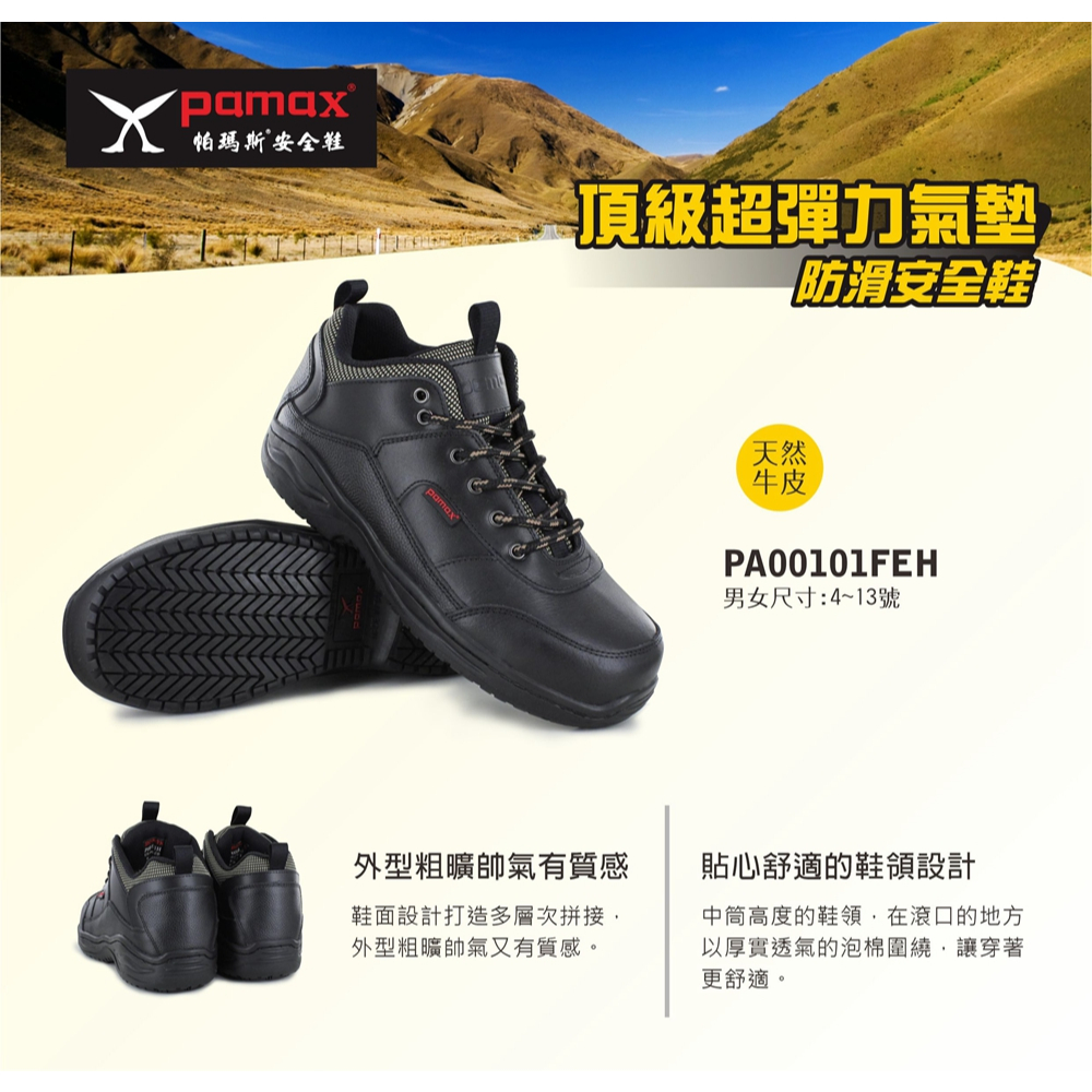 • PAMAX 帕瑪斯-皮革製頂級超彈力氣墊防滑安全鞋/PA00101FEH/黑/男女尺寸/天然牛皮/專利防滑橡膠大底