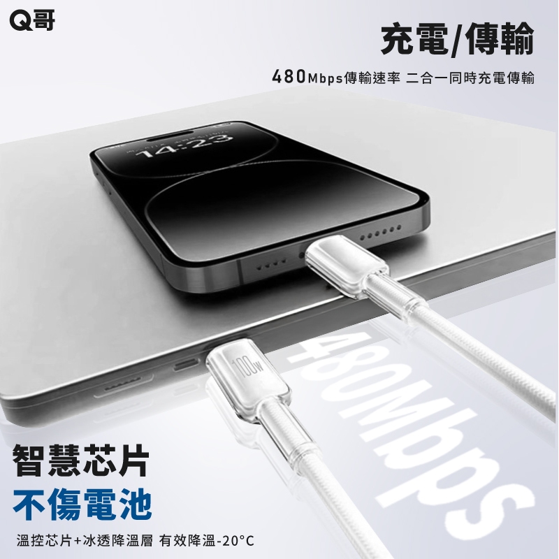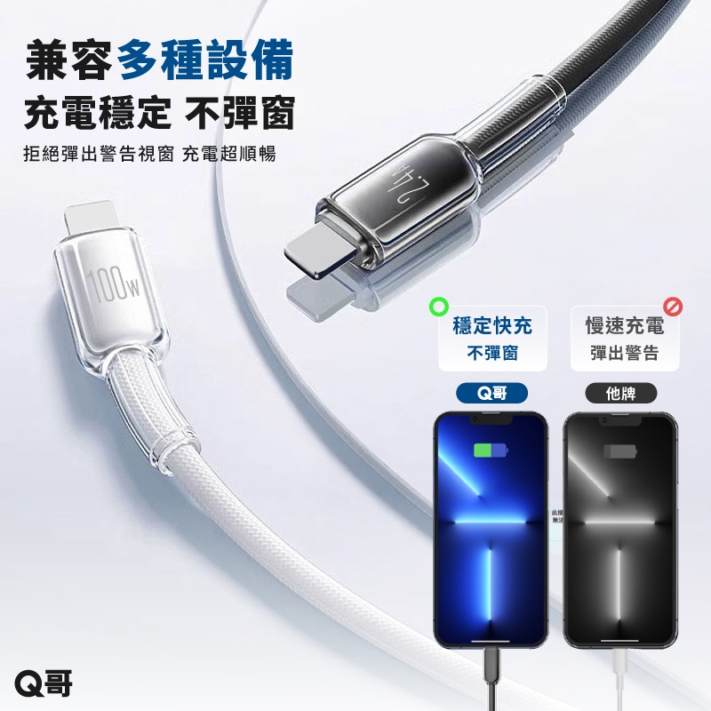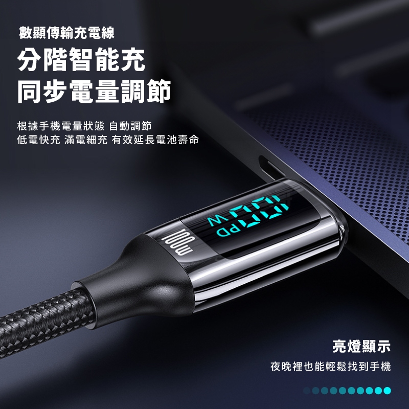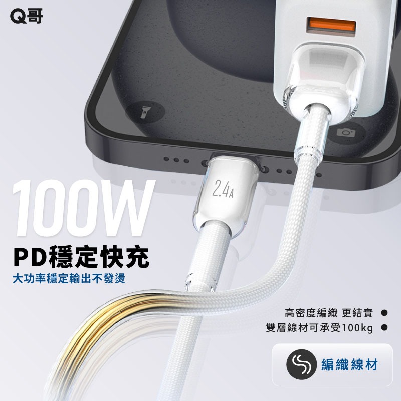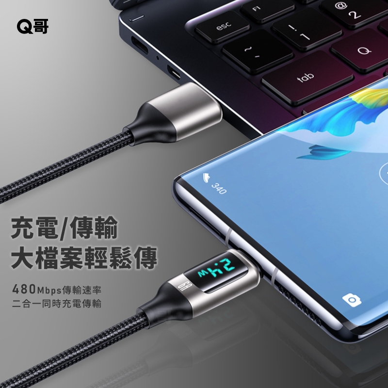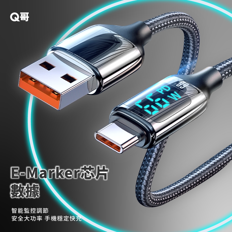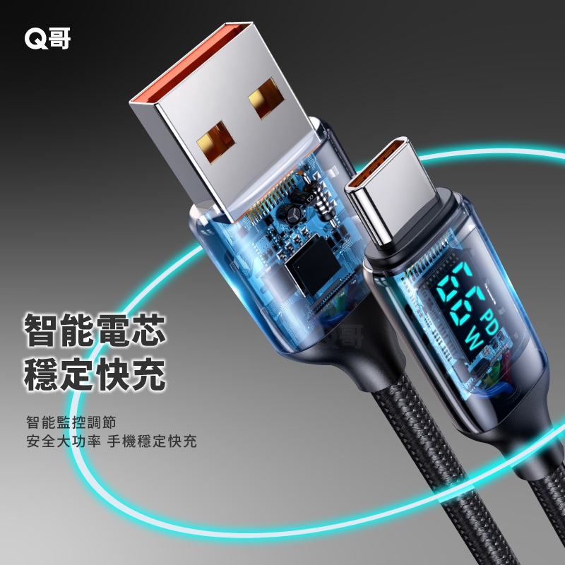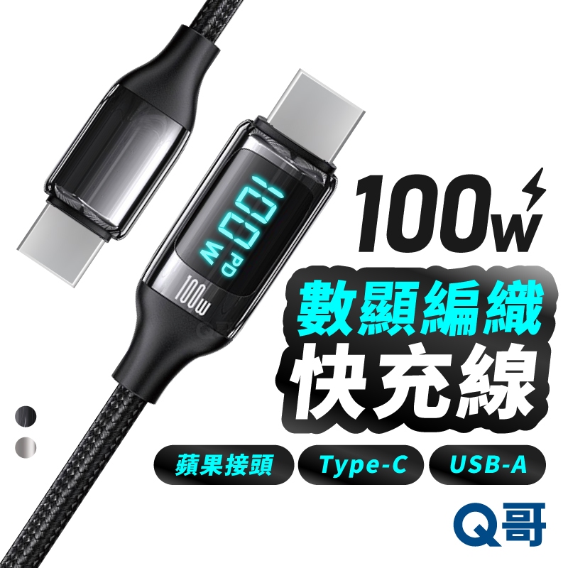 Q哥 數顯充電線 100W TypeC PD快充 適用 蘋果 安卓 傳輸線 USB-A 快充線 編織線 充電線 數顯線