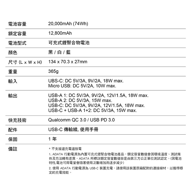 威剛 ADATA P20000QCD 數位螢幕顯示 20000mAh 18W PD QC 3.0 快充 行動電源 公司貨藍色|黑色|白色Powerbanks & BatteriesPulaPula | 3C產品 | 手機周邊 | Switch&PS5 遊戲片
