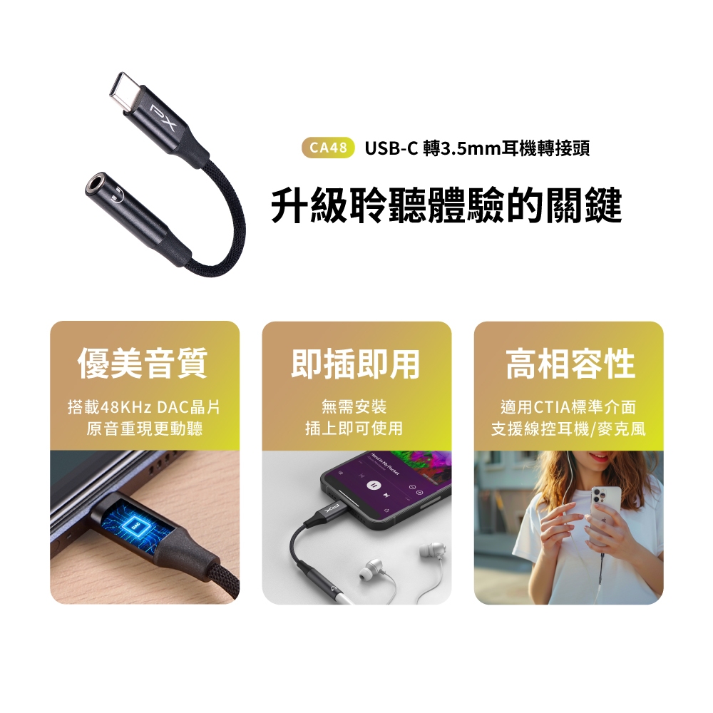 PX大通 CA48 C轉3.5mm type-c 耳機轉接頭 DAC晶片 3年保固 USB-C(公)- 3.5mm(母)CA48Cables, Chargers & ConvertersPX大通電子官方UHD 8K HDMI影音旗艦館