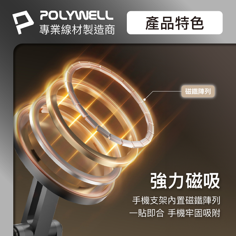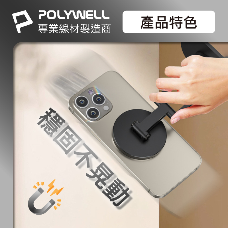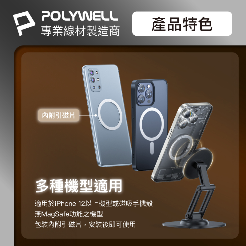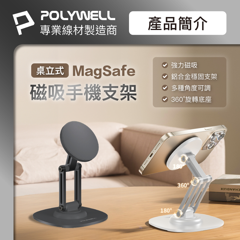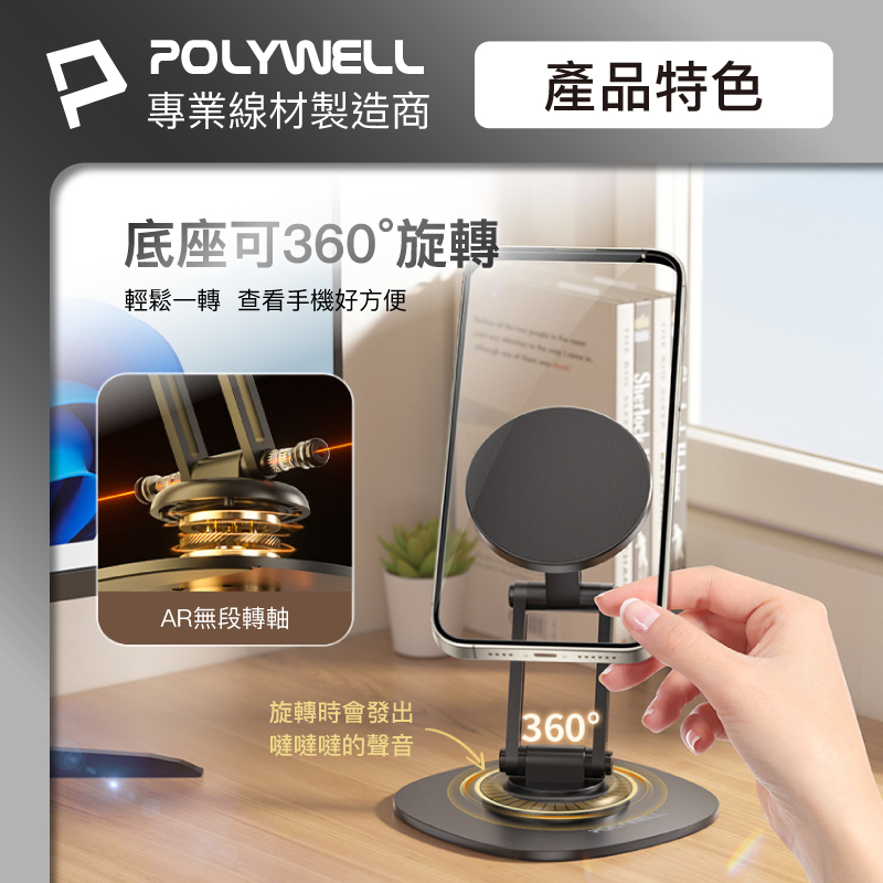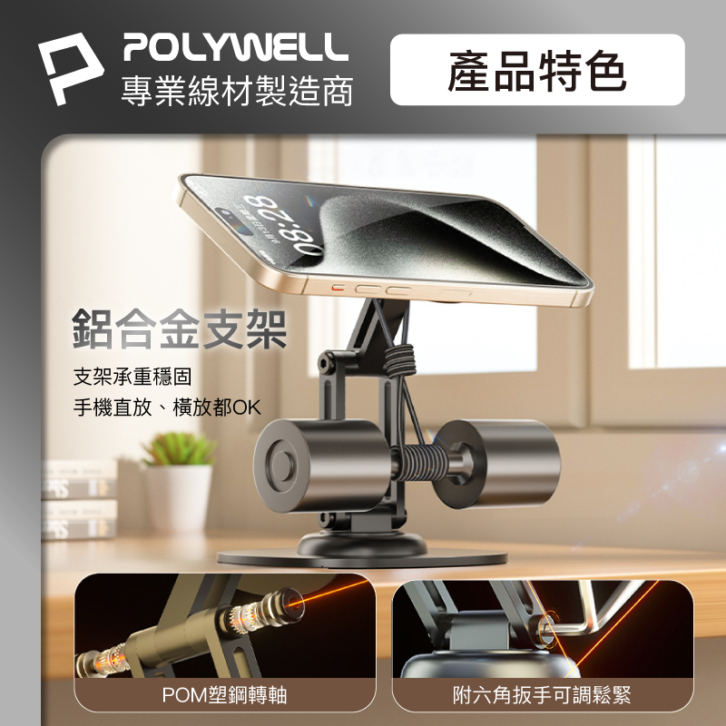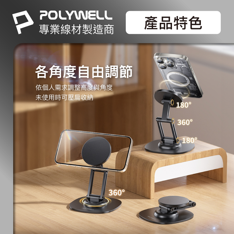 POLYWELL 磁吸手機支架 鋁合金支架 MagSafe磁吸適用 高度角度可調 360度旋轉底座 寶利威爾 台灣現貨黑色|白色Phone GripsPOLYWELL寶利威爾官方旗艦店