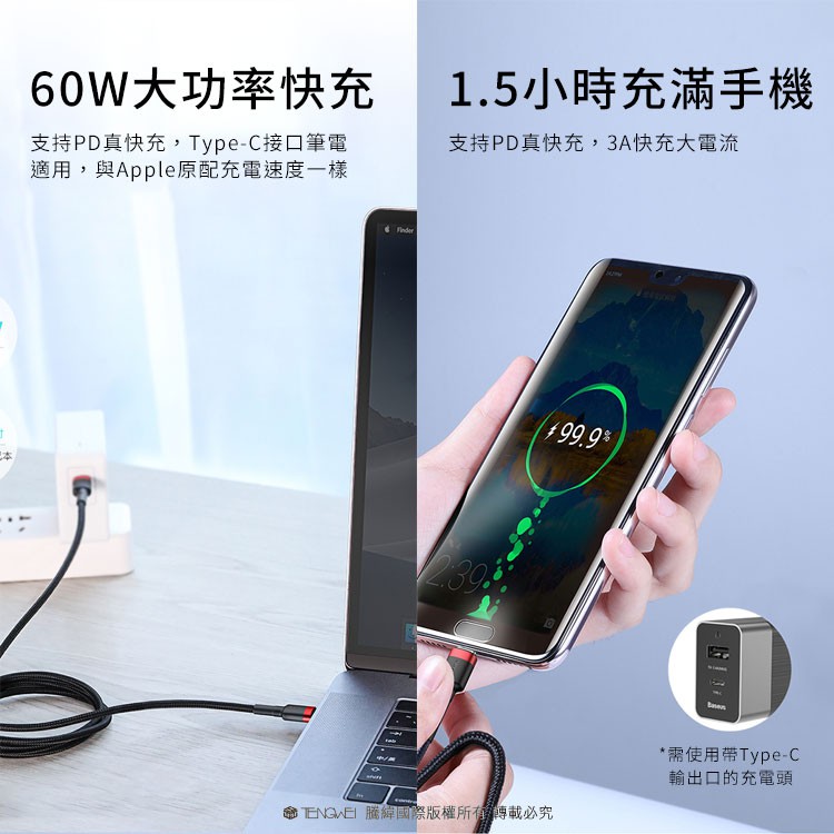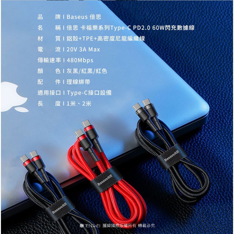 【Baseus倍思】卡福樂 Type-C to Type-C 傳輸線 充電線PD2.0閃充 60W/100W 蘋果1560W_1M/灰黑色|60W_1M/紅黑色|60W_1M/紅紅色|60W_2M/灰黑色|60W_2M/紅紅色|60W_2M/紅黑色|100W_2M/紅黑|100W_2M/灰黑Cables, Chargers & ConvertersNawies 手機配件 | 代理 倍思 / Lisen / amuok