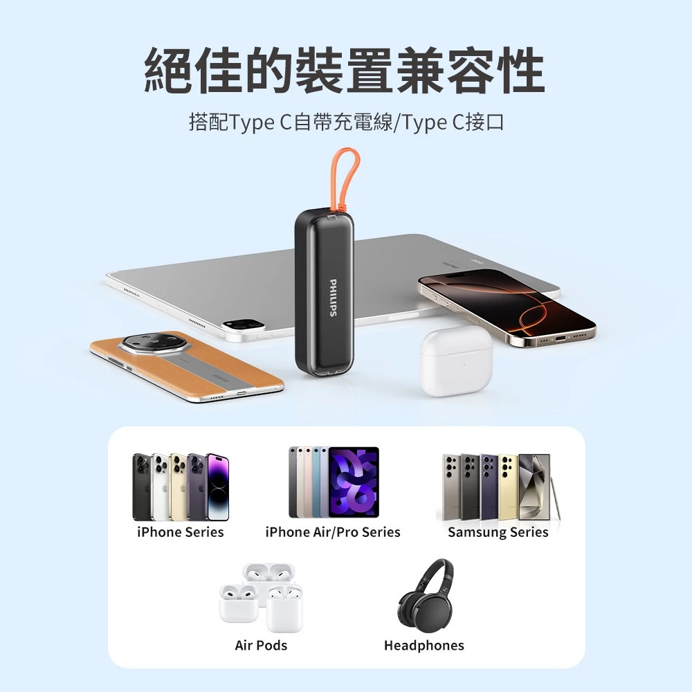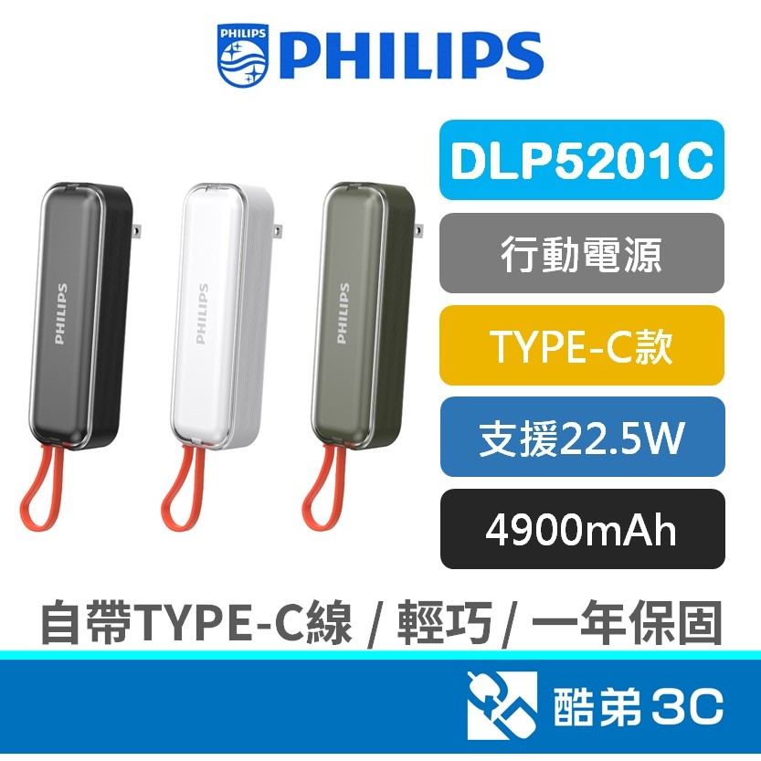 現貨【免運】PHILIPS 飛利浦 自帶線 行動電源 22.5W TYPE-C 口袋袖珍 充電寶 DLP5201C黑|白|綠Powerbanks & BatteriesQD 酷弟3C
