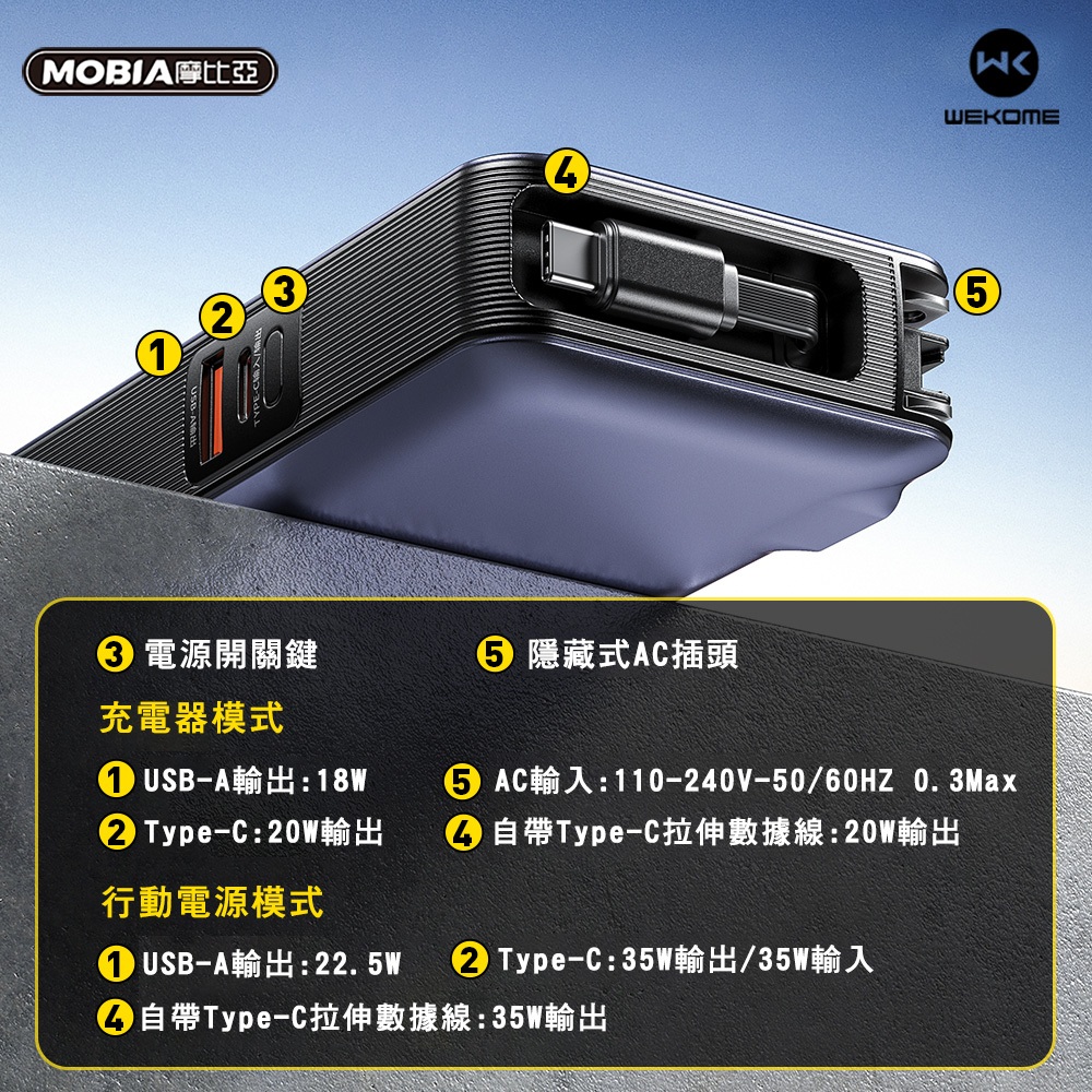 【CCC認證】WEKOME 無界二代35W高功率多功能AC行動電源10000mAh 自帶TypeC伸縮線 正版台灣公司貨
