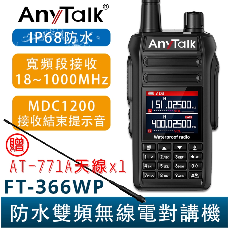 AnyTalk FT-366WP IP68 防水無線對講機 10W 寬頻段接收 贈 771A天線 一鍵對頻 366 現貨FT-366WP|FT-366WP+771A天線|FT-366電池一顆ROWA 樂華數位