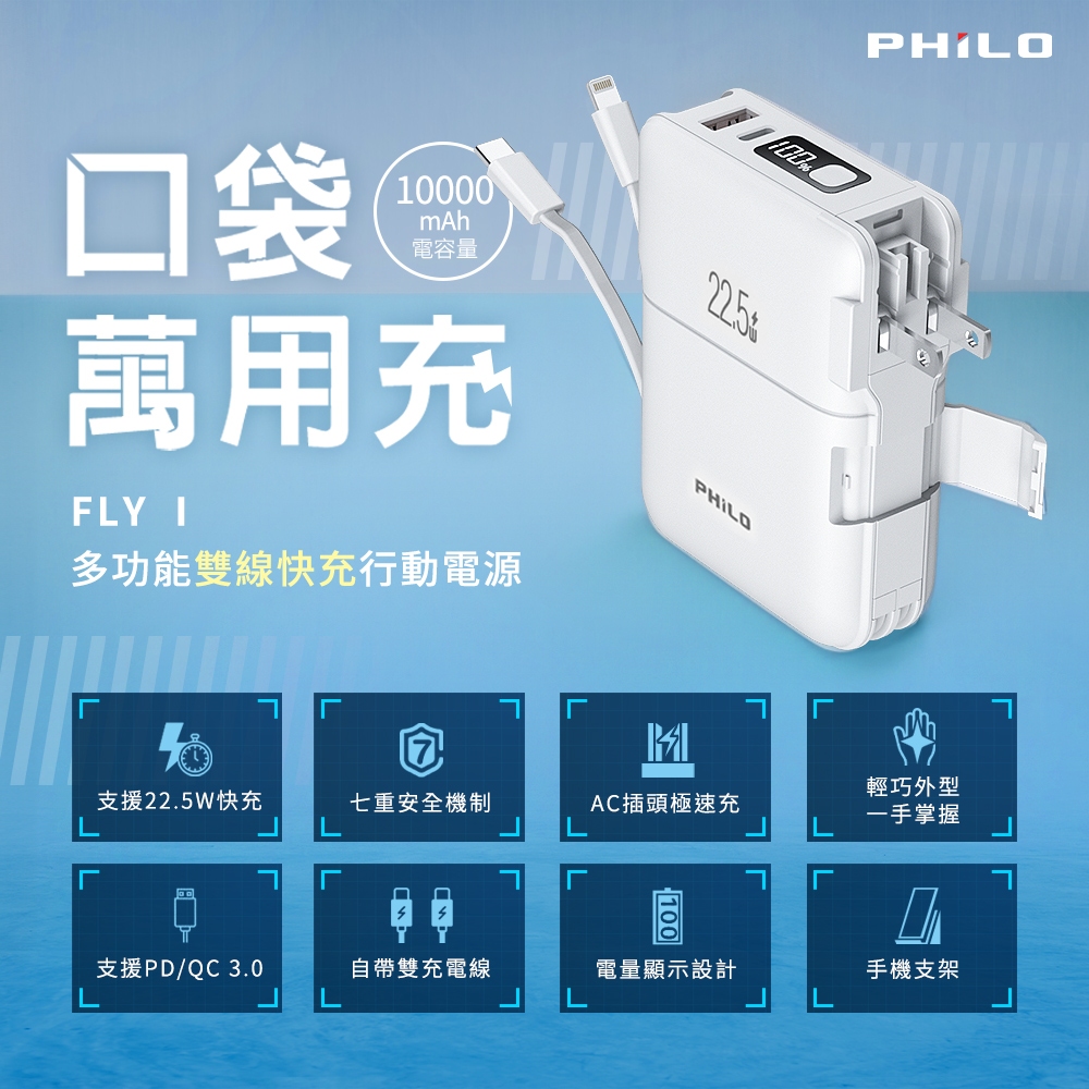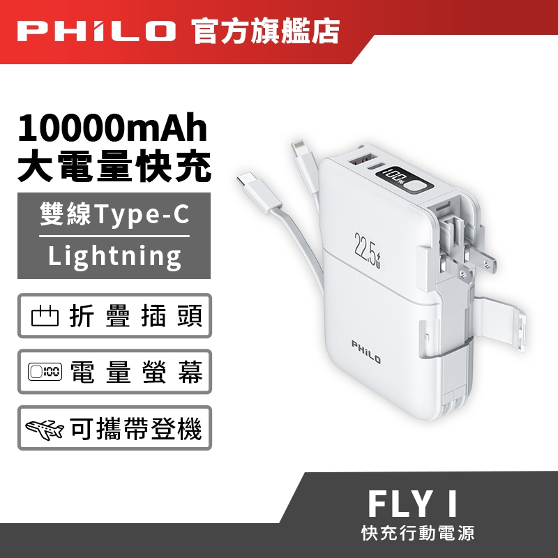 【Philo飛樂】FLY1口袋萬用充 多功能雙線快充行動電源 AC插頭 10000mAH大容量 台灣現貨 官方原廠直送