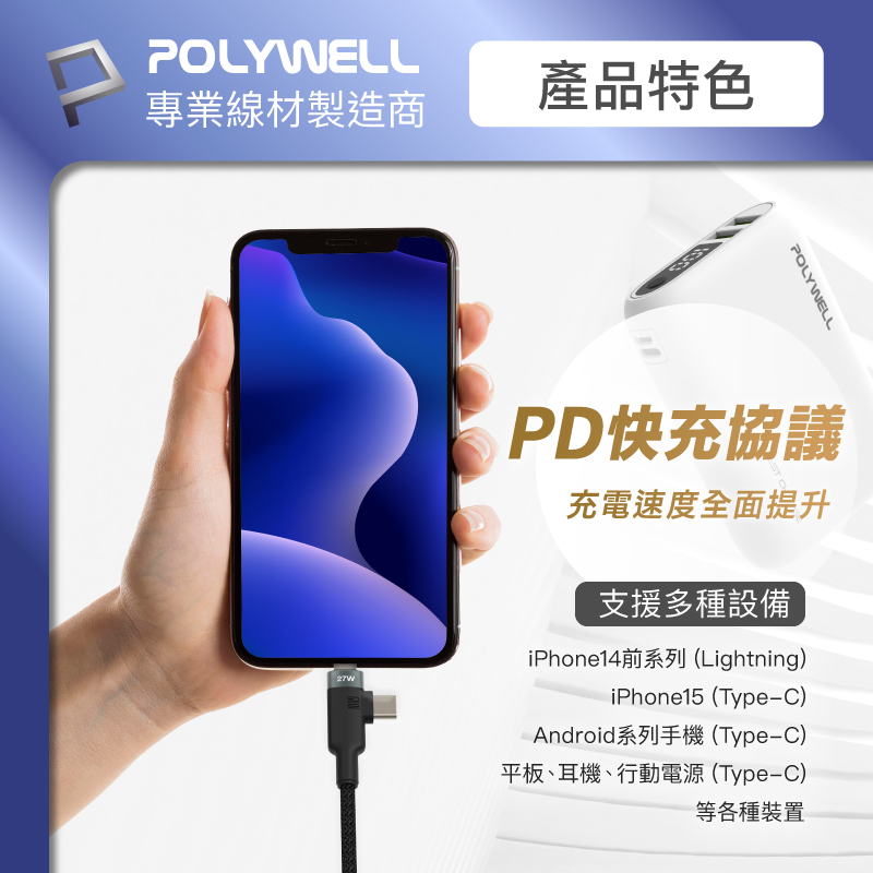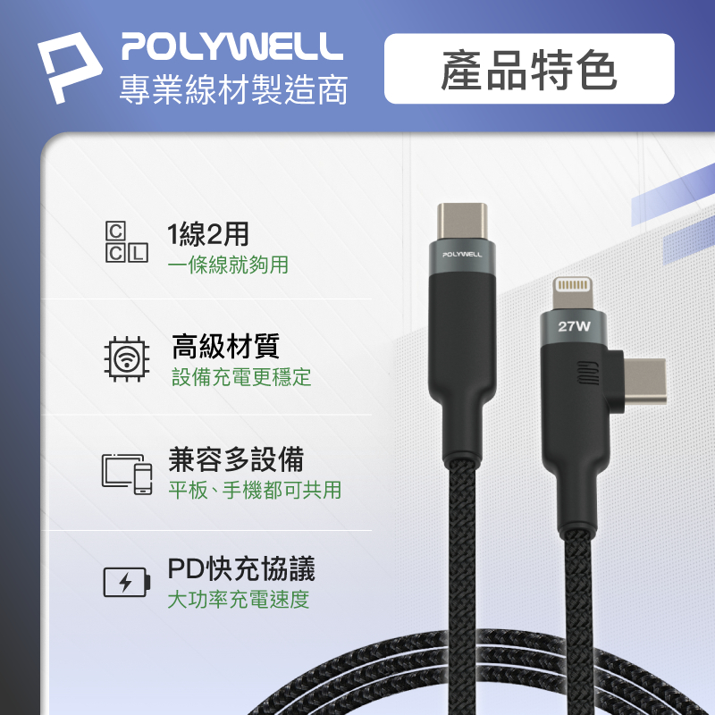 POLYWELL 二合一T型編織快充線 USB-C To C+Lightning 適用iPhone 寶利威爾 台灣現貨1米Cables, Chargers & ConvertersPOLYWELL寶利威爾官方旗艦店