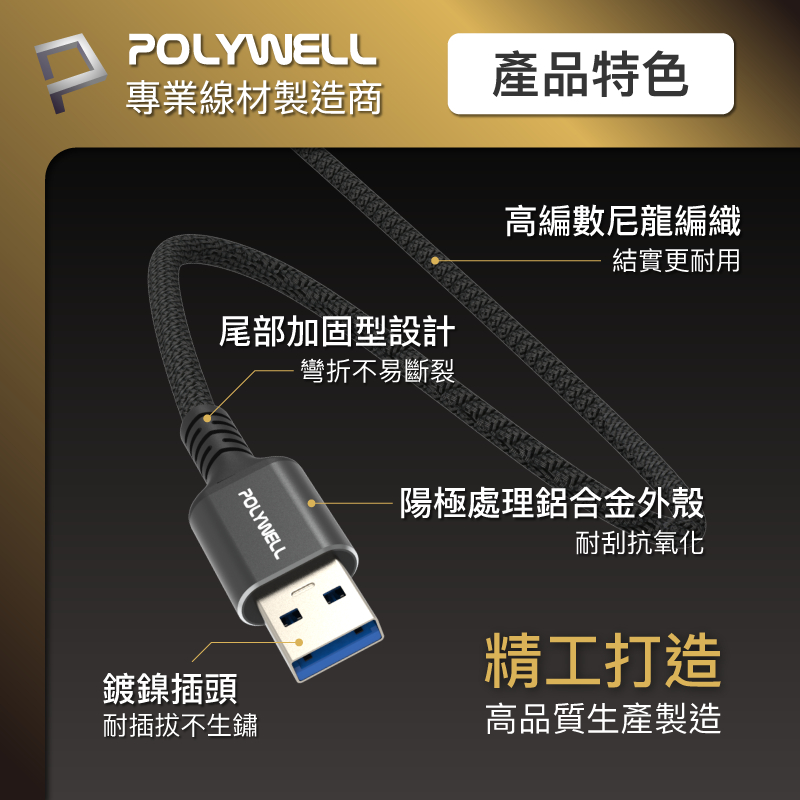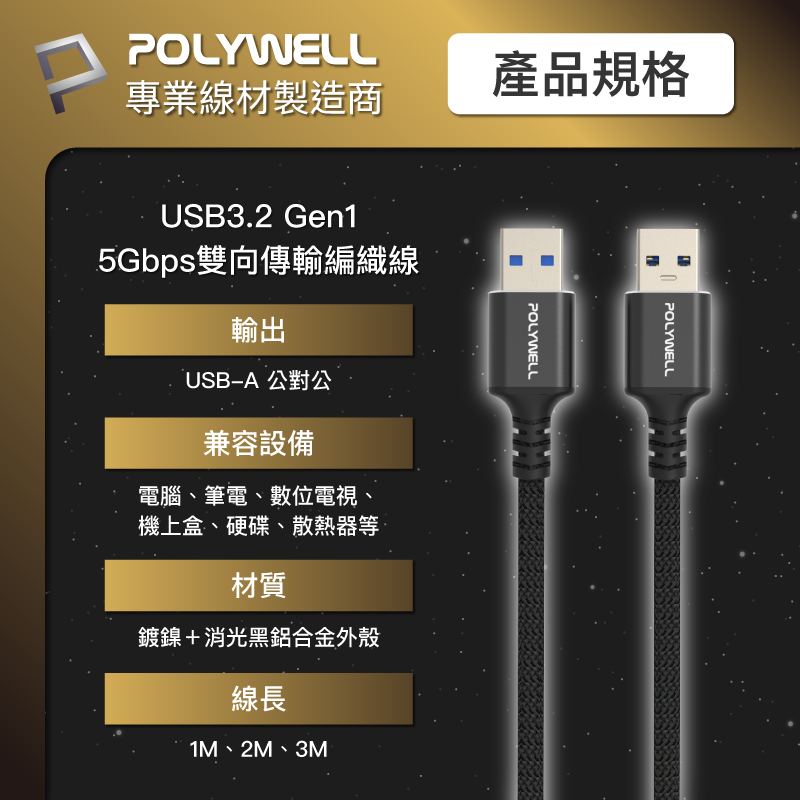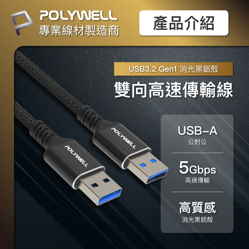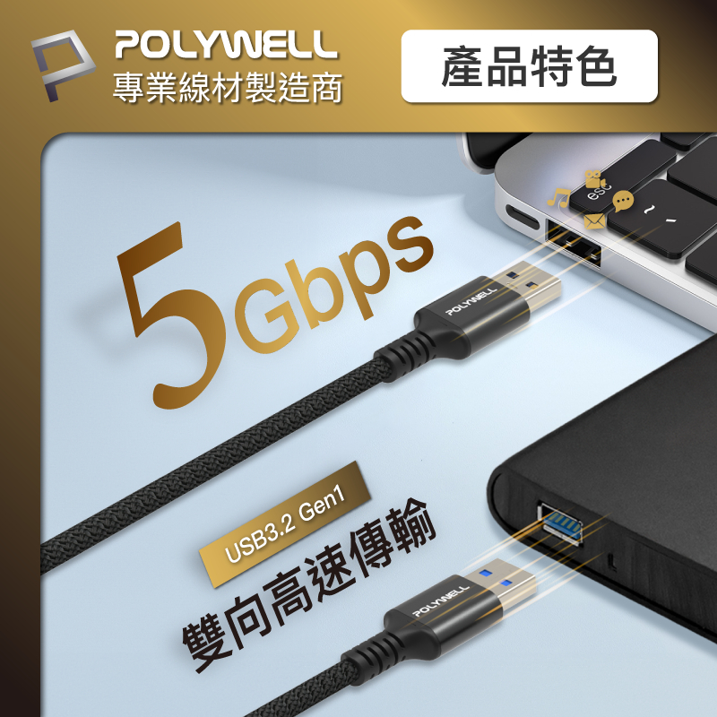 POLYWELL 黑金剛 USB3.2 Type-A 公對公 高速傳輸線 Gen1 5Gbps 寶利威爾 台灣現貨1米/100公分|2米/200公分|3米/300公分Cables, Chargers & ConvertersPOLYWELL寶利威爾官方旗艦店