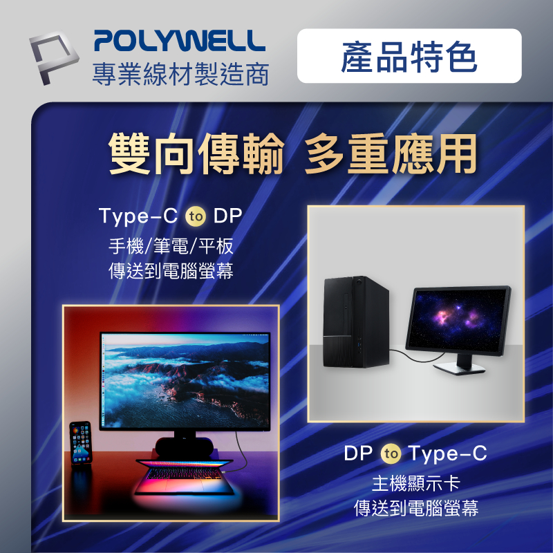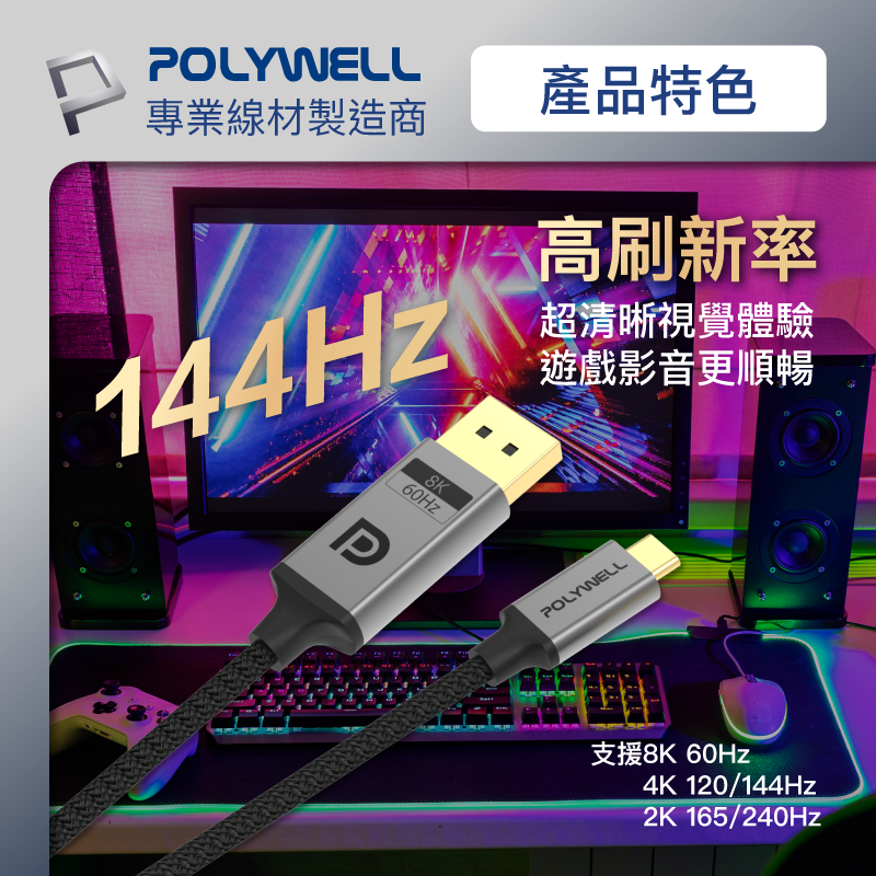 POLYWELL Type-C轉DP 8K 影音傳輸線 雙向傳輸 鋁合金 帶編織 適用電競螢幕 寶利威爾 台灣現貨1米|2米|3米Cables, Chargers & ConvertersPOLYWELL寶利威爾官方旗艦店