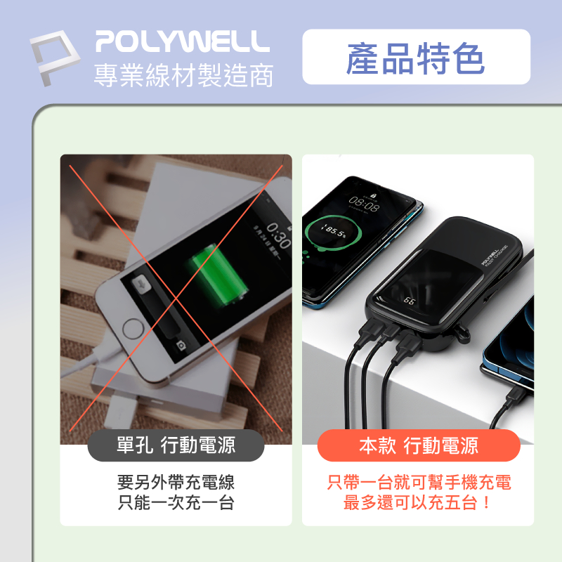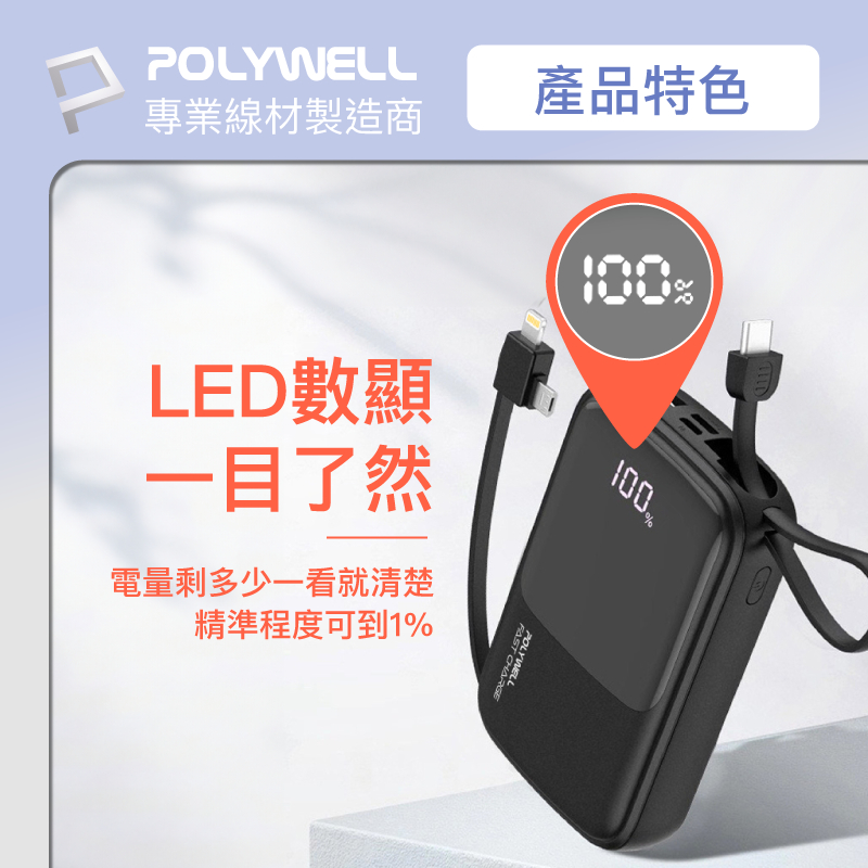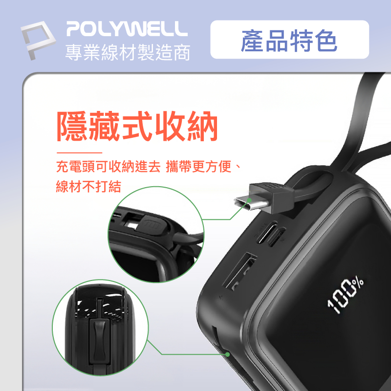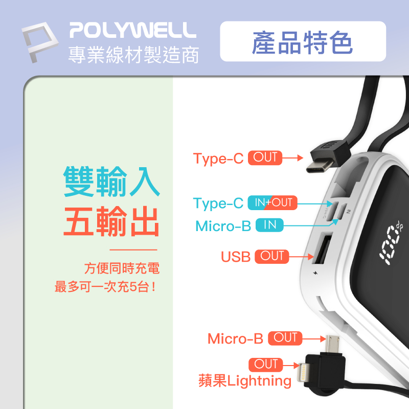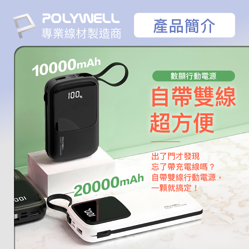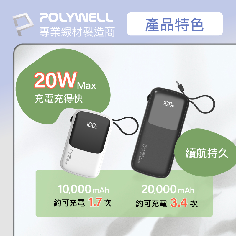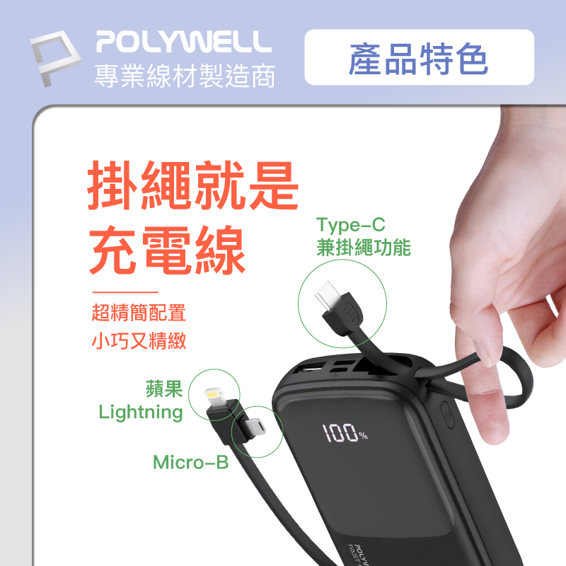 POLYWELL 自帶線快充行動電源 1萬/2萬mAh USB-A Type-C Lightning 寶利威爾 台灣現貨黑色,10000mAh|黑色,20000mAh|白色,10000mAh|白色,20000mAhPowerbanks & BatteriesPOLYWELL寶利威爾官方旗艦店