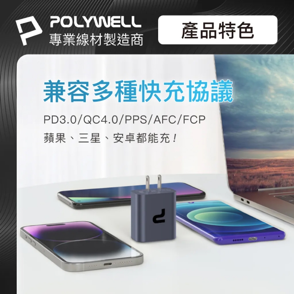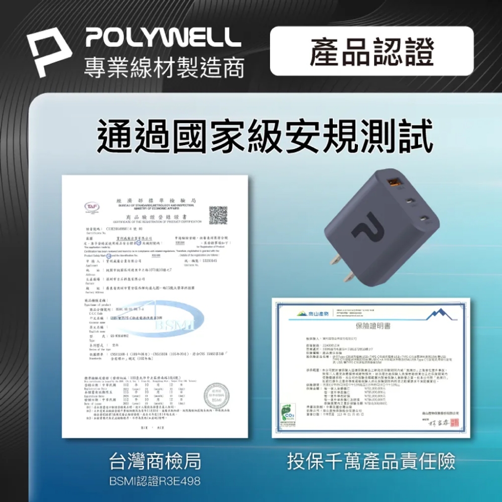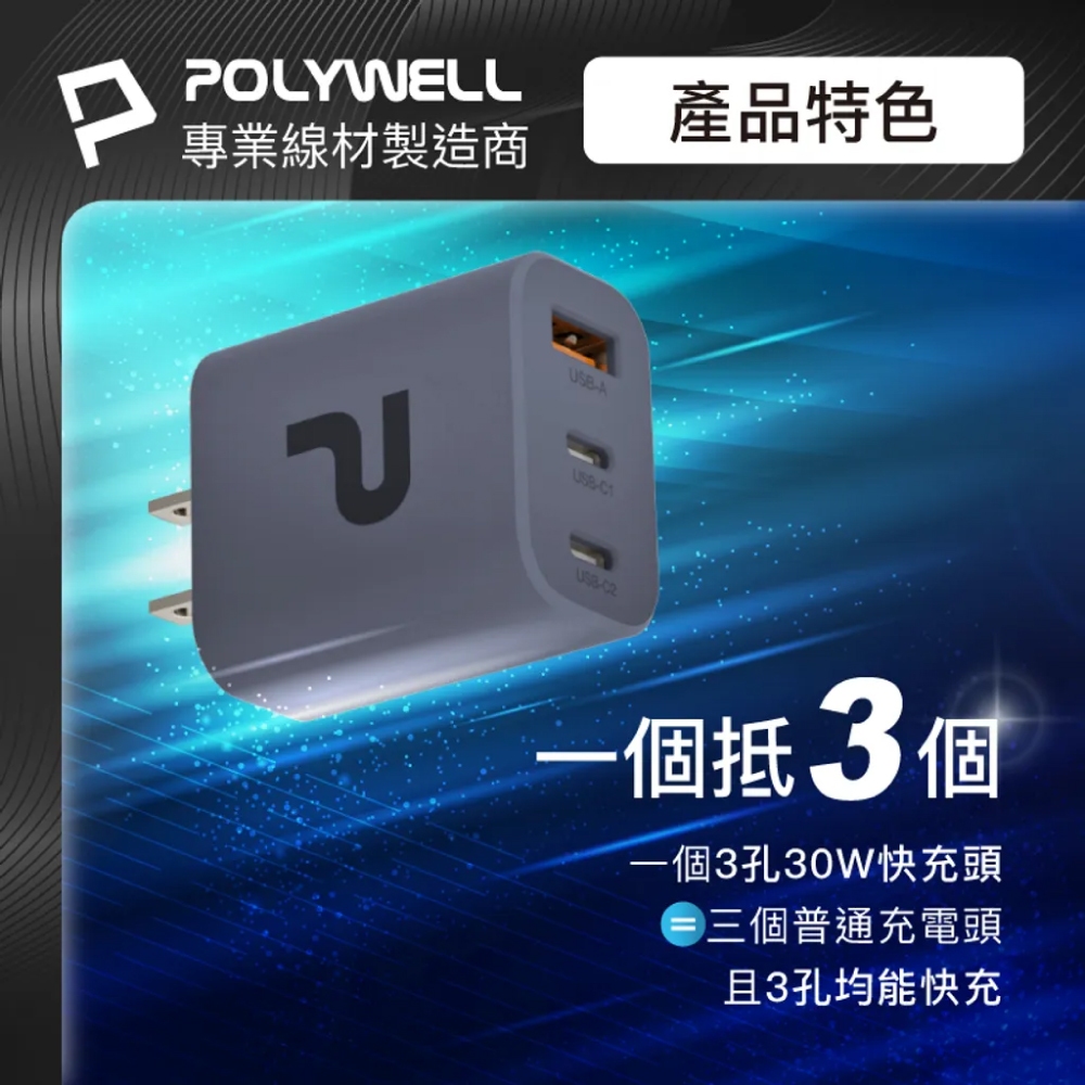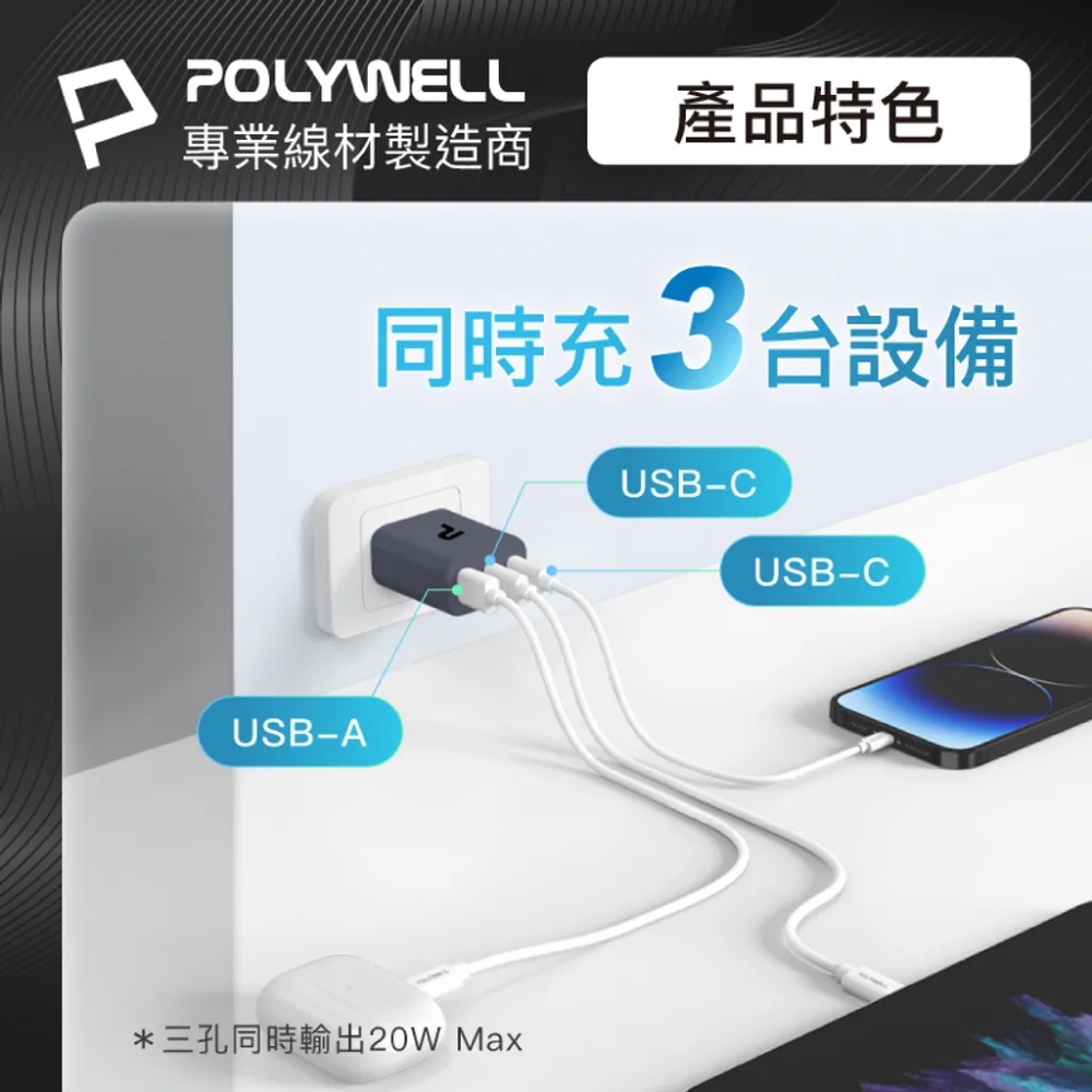 【POLYWELL】30W三孔PD快充頭 雙Type-C+USB-A 豆腐頭 充電頭 GaN氮化鎵黑色|槍色|白色Cables, Chargers & ConvertersNawies 手機配件 | 代理 倍思 / Lisen / amuok
