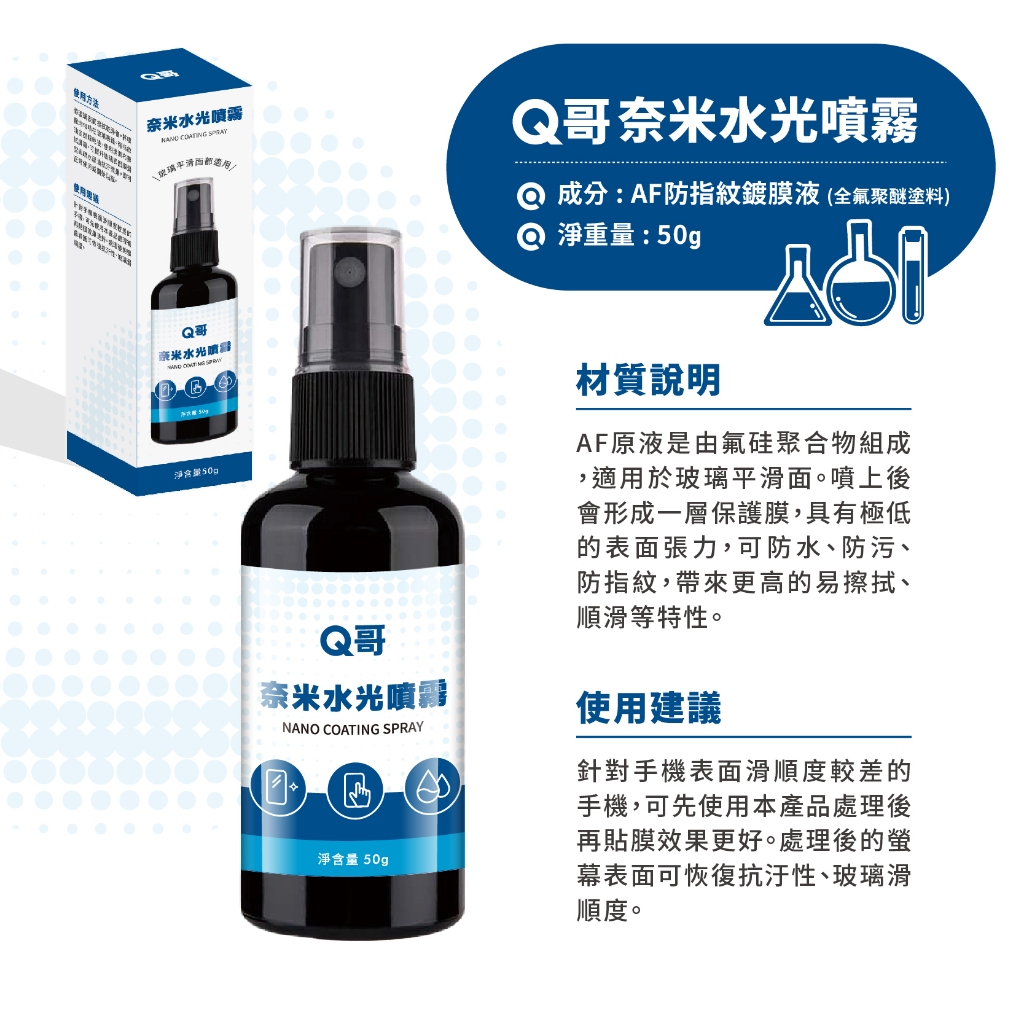 Q哥 奈米水光噴霧 螢幕鍍膜 防指紋 AF指紋油 玻璃鍍膜 玻璃保護貼 清潔 噴霧 手機螢幕 噴霧 清潔液 N001Q哥奈米水光噴霧 50gOthersQ哥 旗艦商城|最專業的保護貼手機配件